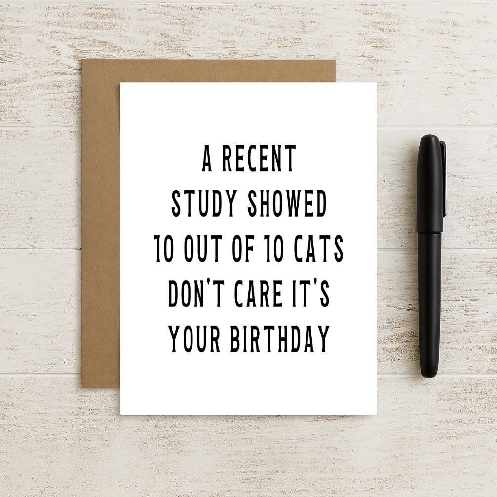 Let’s face it — cats are the queens and kings of not giving a fluff. Celebrate that same energy with this “A Recent Study Showed 10 out of 10 Cats Don’t Care It's Your Birthday” birthday card, perfect for your favorite sarcastic friend or unapologetic cat lover. Whether they’re turning 25 or 75, this card delivers a birthday laugh with zero sugar-coating and maximum cattitude.