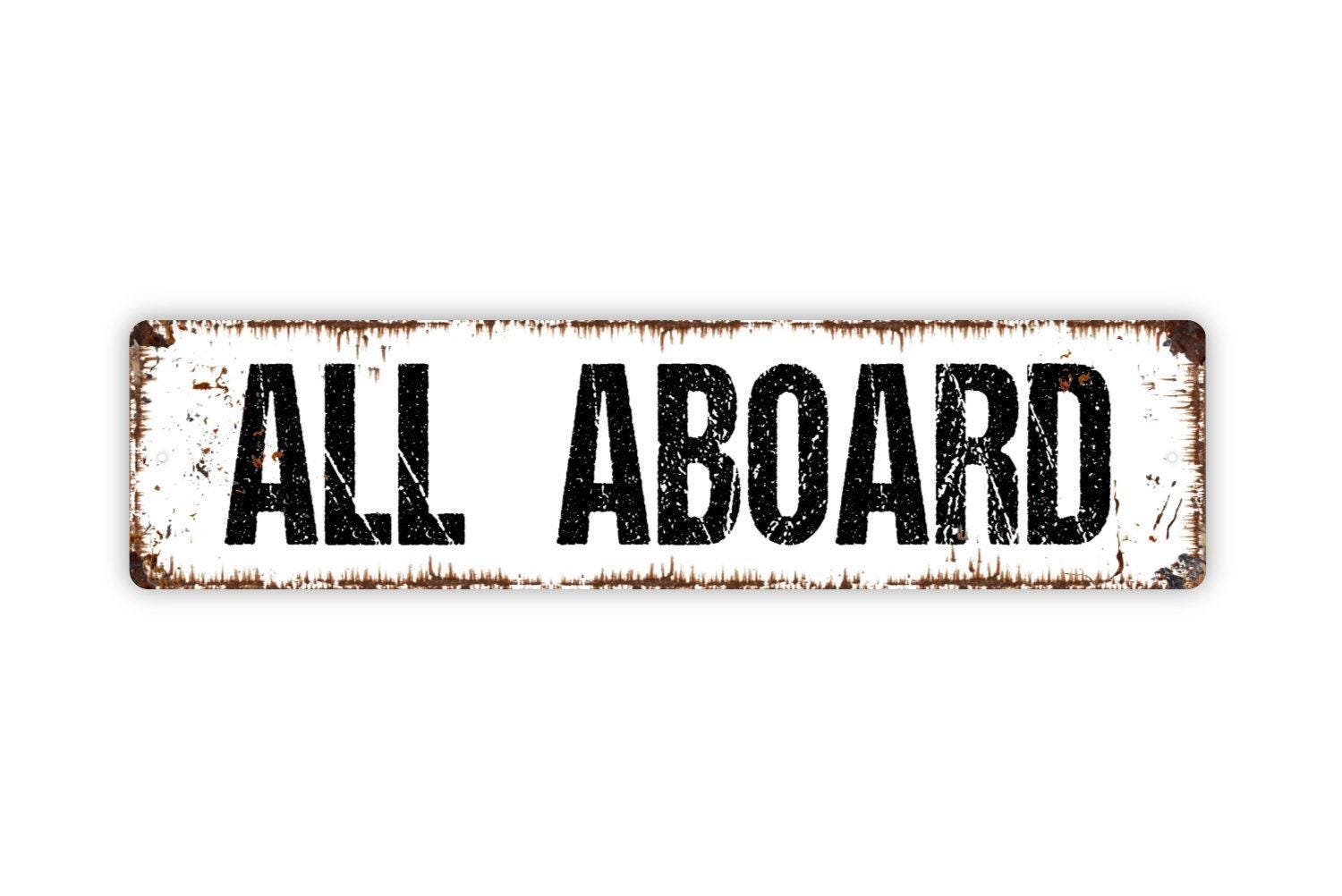 All Aboard Sign - Train Station Locomotive Air Plane Pilot Engineer Vinyl Sticker Or Metal Street Sign or Door Name Plate Plaque
