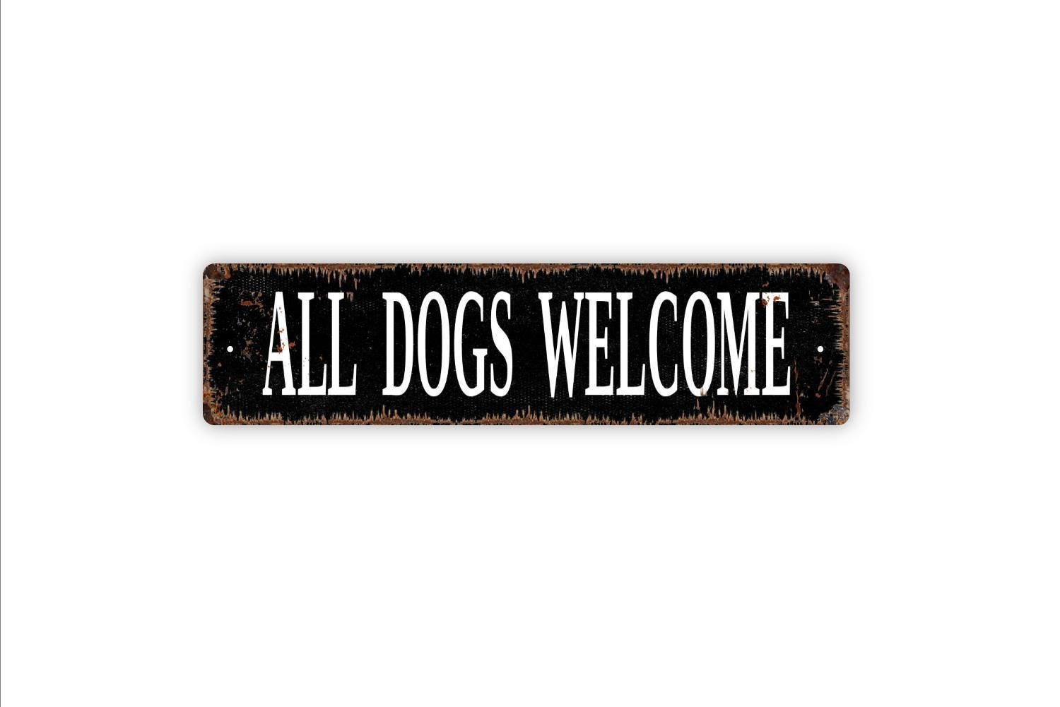 All Dogs Welcome Sign - Dog Pup Puppy Vinyl Sticker Or Metal Street Sign or Door Name Plate Plaque Indoor Or Outdoor