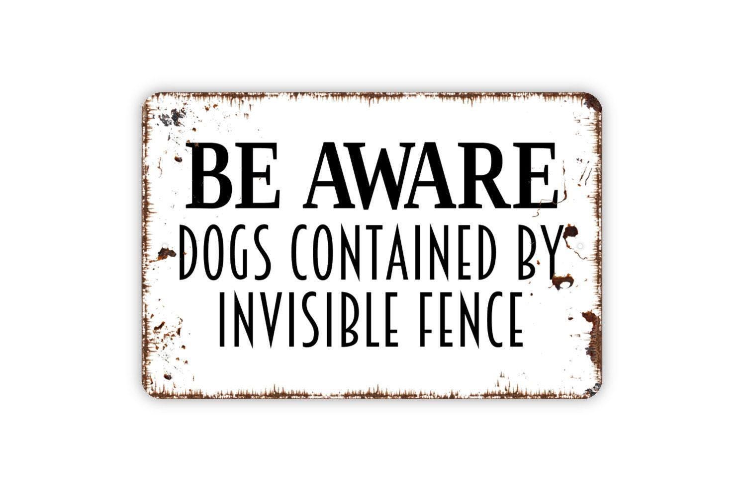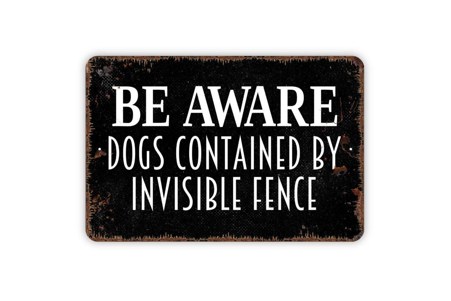Be Aware Dogs Contained By Invisible Fence Sign | Yard Safety Wall Decor | Metal Sign or Vinyl Sticker for Homes, Lawns, or Properties