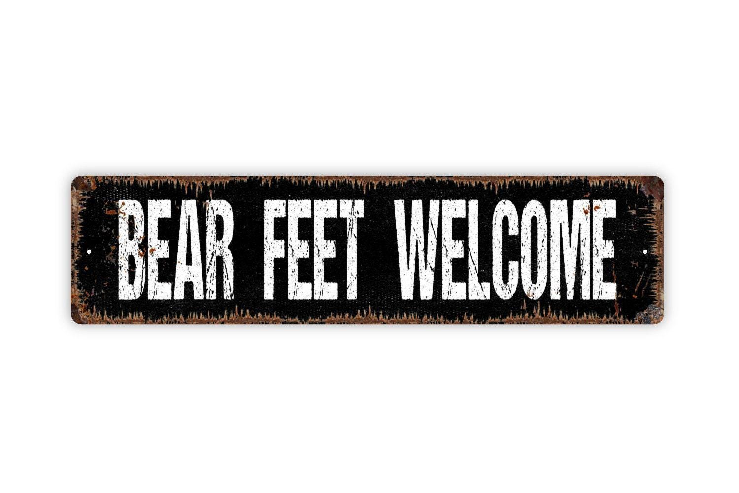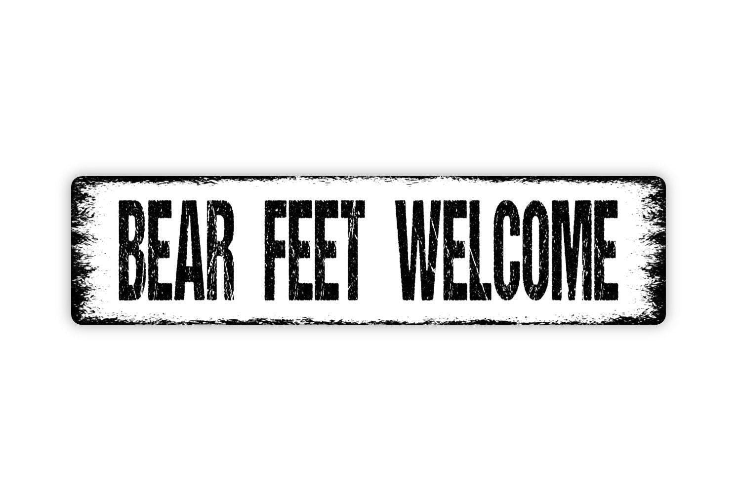 Bear Feet Welcome Sign - Funny Pun Wildlife Animal Bear Crossing Wipe Your Paws Rustic Street Metal Sign or Door Name Plate Plaque