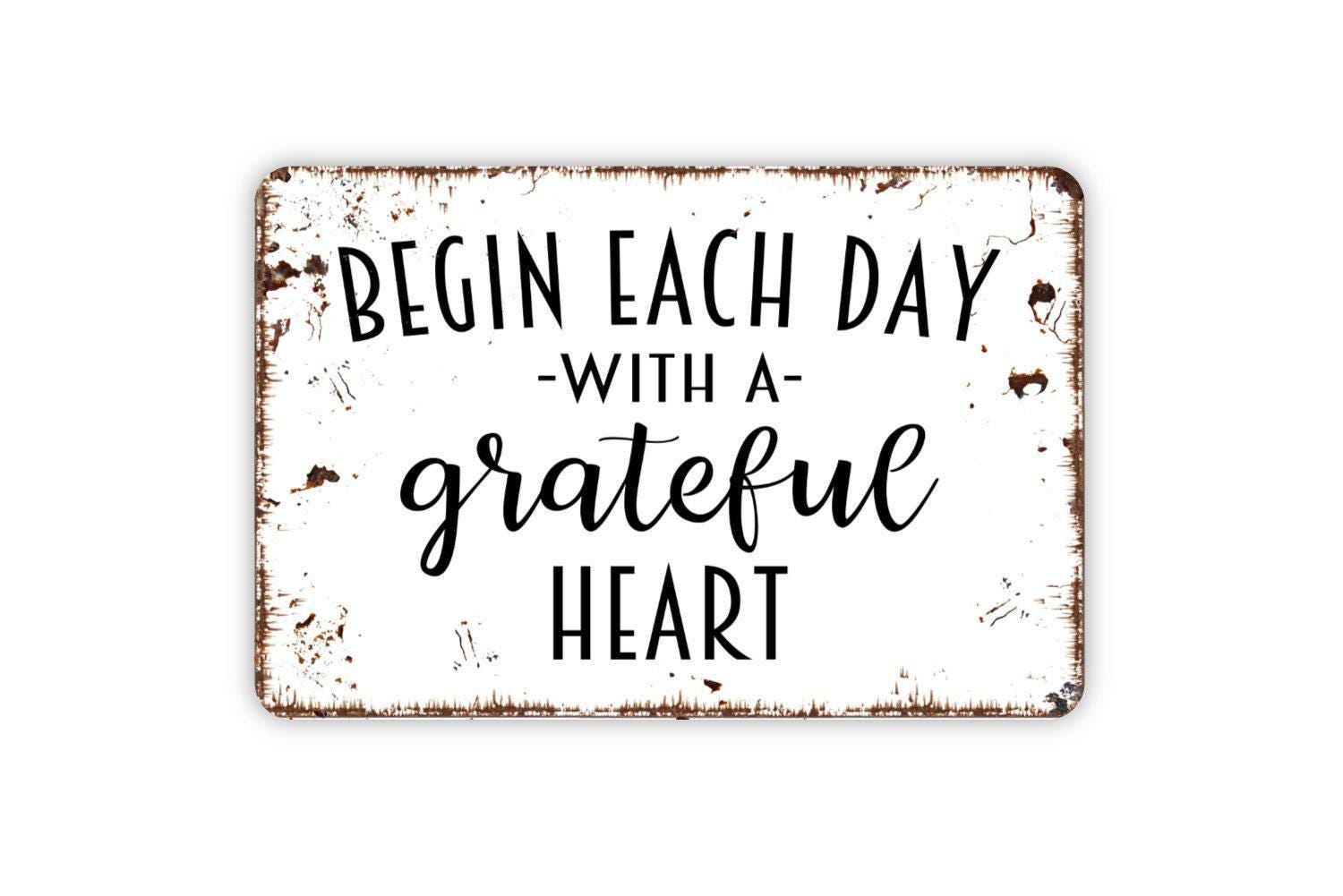 Begin Each Day With A Grateful Heart Sign, Christian Bible Verse Metal Sign, Farmhouse Contemporary Modern Wall Metal Sign