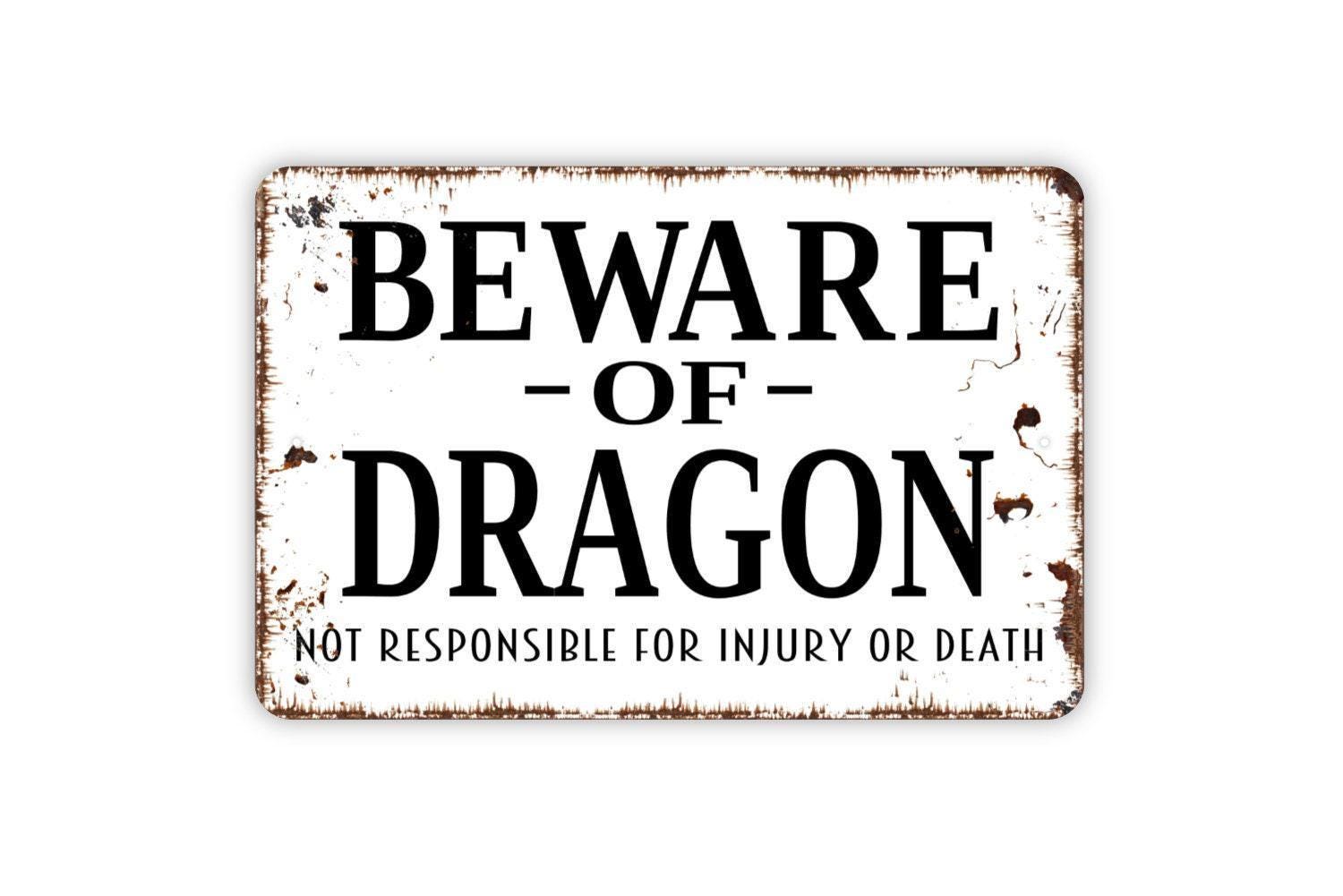 Beware Of Dragon Sign – Funny Fantasy Wall Decor – Rustic Medieval Dungeon Castle Game Room Sign – Metal Sign or Sticker