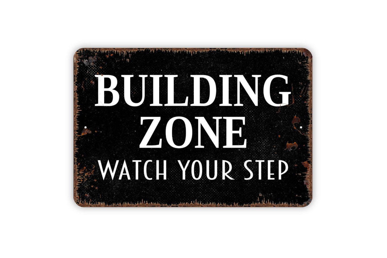Building Zone Watch Your Step Sign - Fun Kids Toy Room Metal Wall Art - Indoor or Outdoor