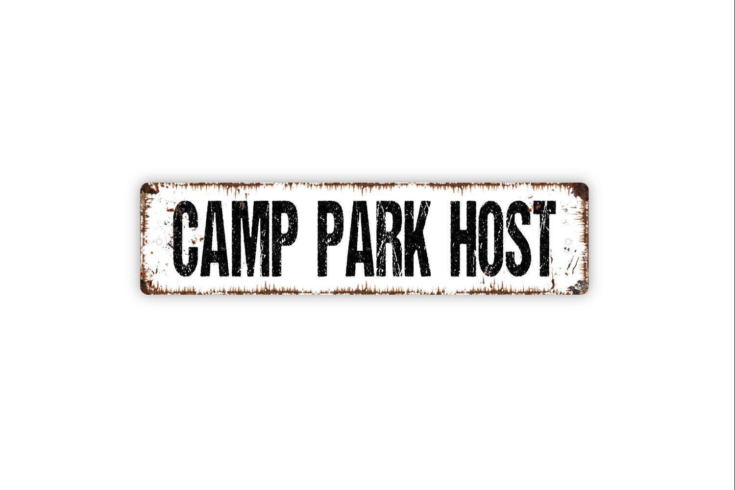 Camp Park Host Sign - Campground Travel Trailer RV Camper Camping Motor Coach Vinyl Sticker Or Street Metal Sign or Door Name Plate Plaque