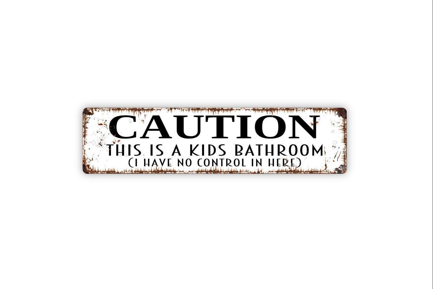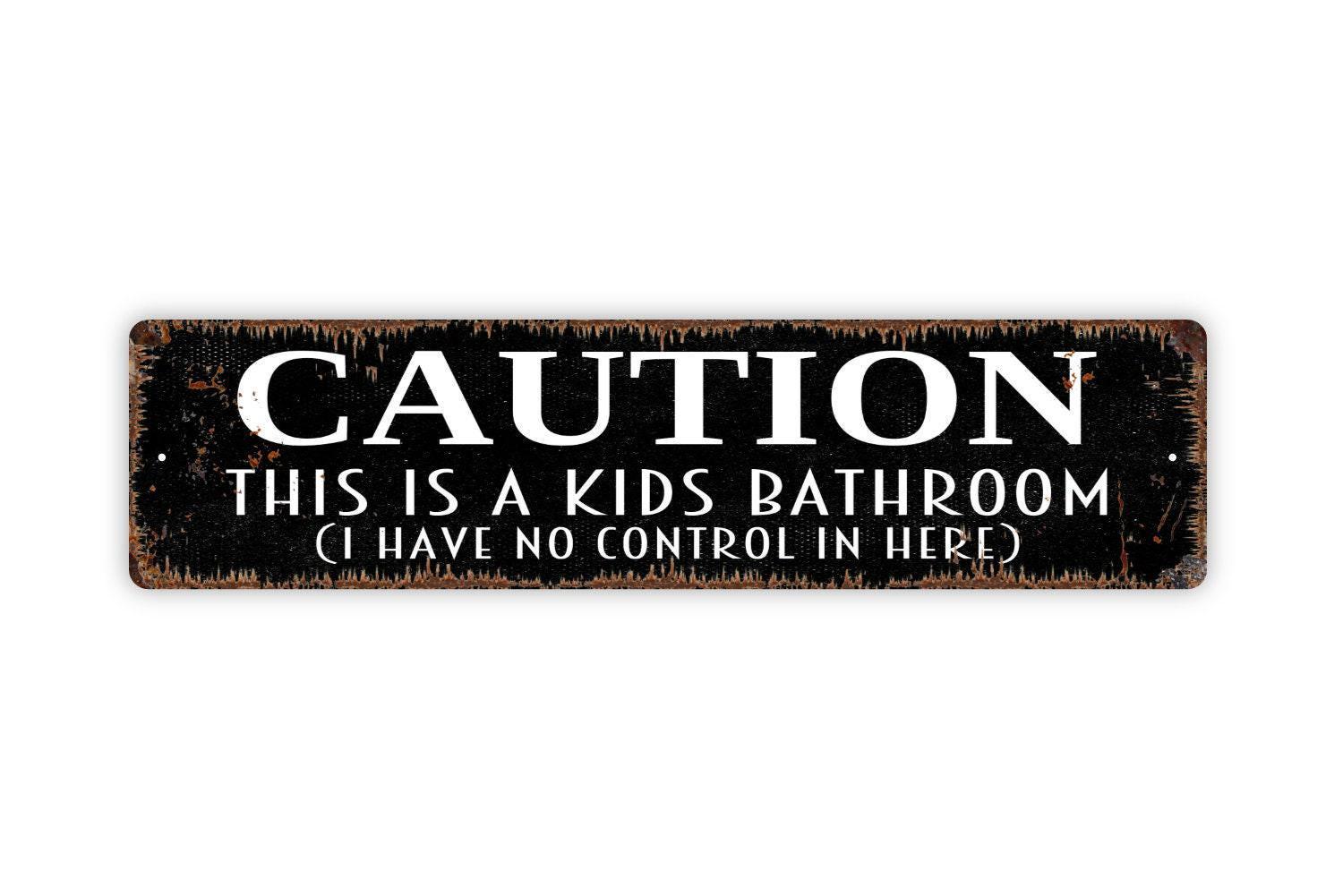 Caution This Is A Kids Bathroom I Have No Control In Here Sign - Funny Restroom Rustic Metal Street Sign or Door Name Plate Plaque