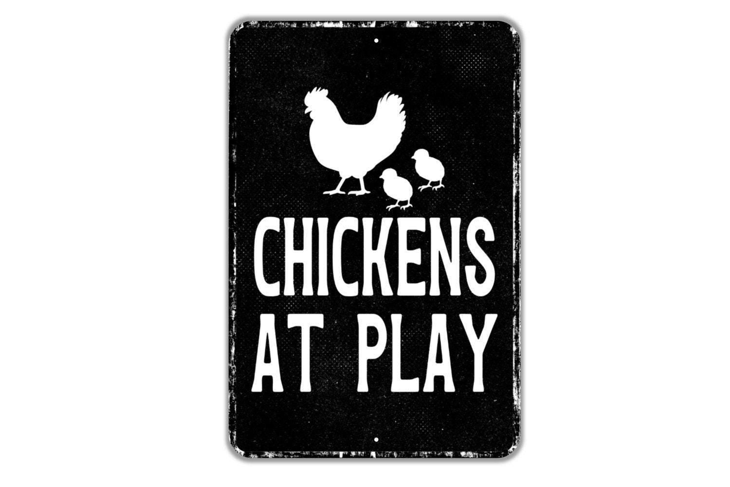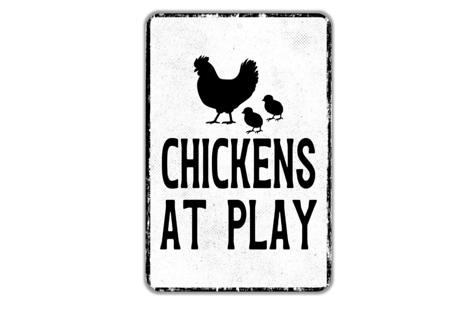 Chickens At Play Sign | Funny Farmhouse Yard Decor | Chicken Coop Wall Sign | Backyard Garden Barn Wall Art | Vinyl Sticker or Metal Sign