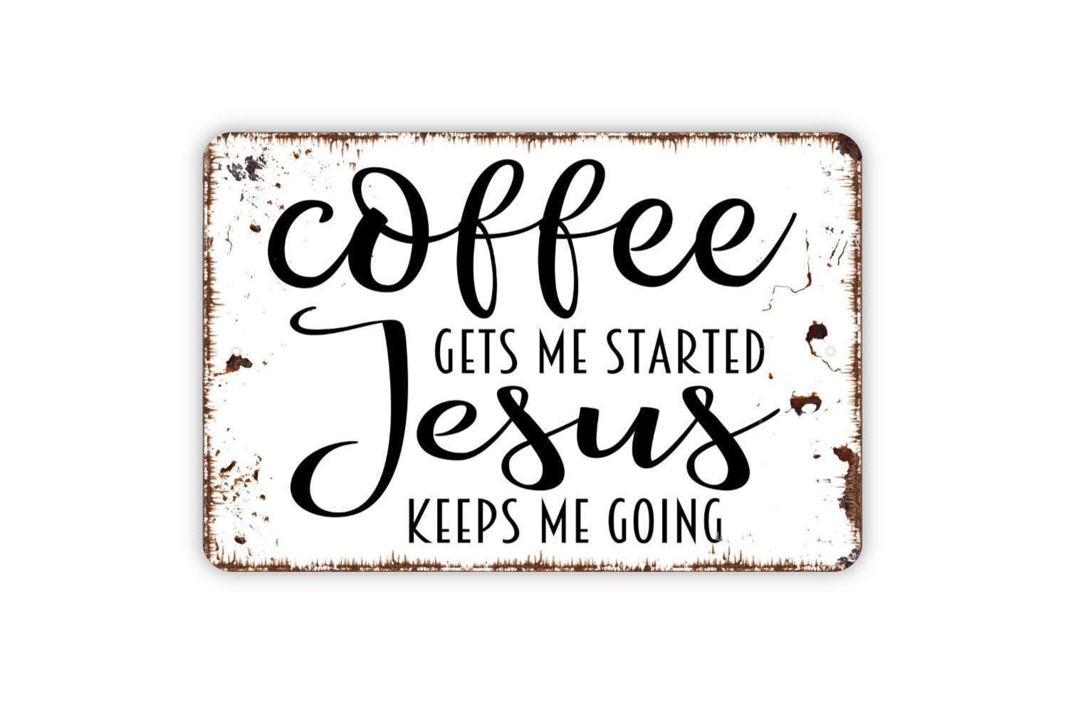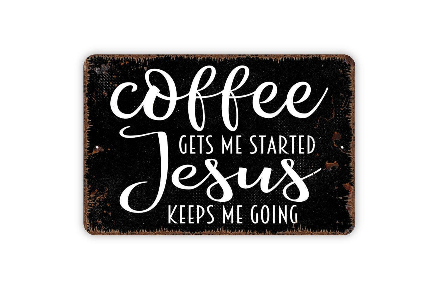 Coffee Gets Me Started Jesus Keeps Me Going Metal Sign, Farmhouse Contemporary Modern Wall Metal Sign