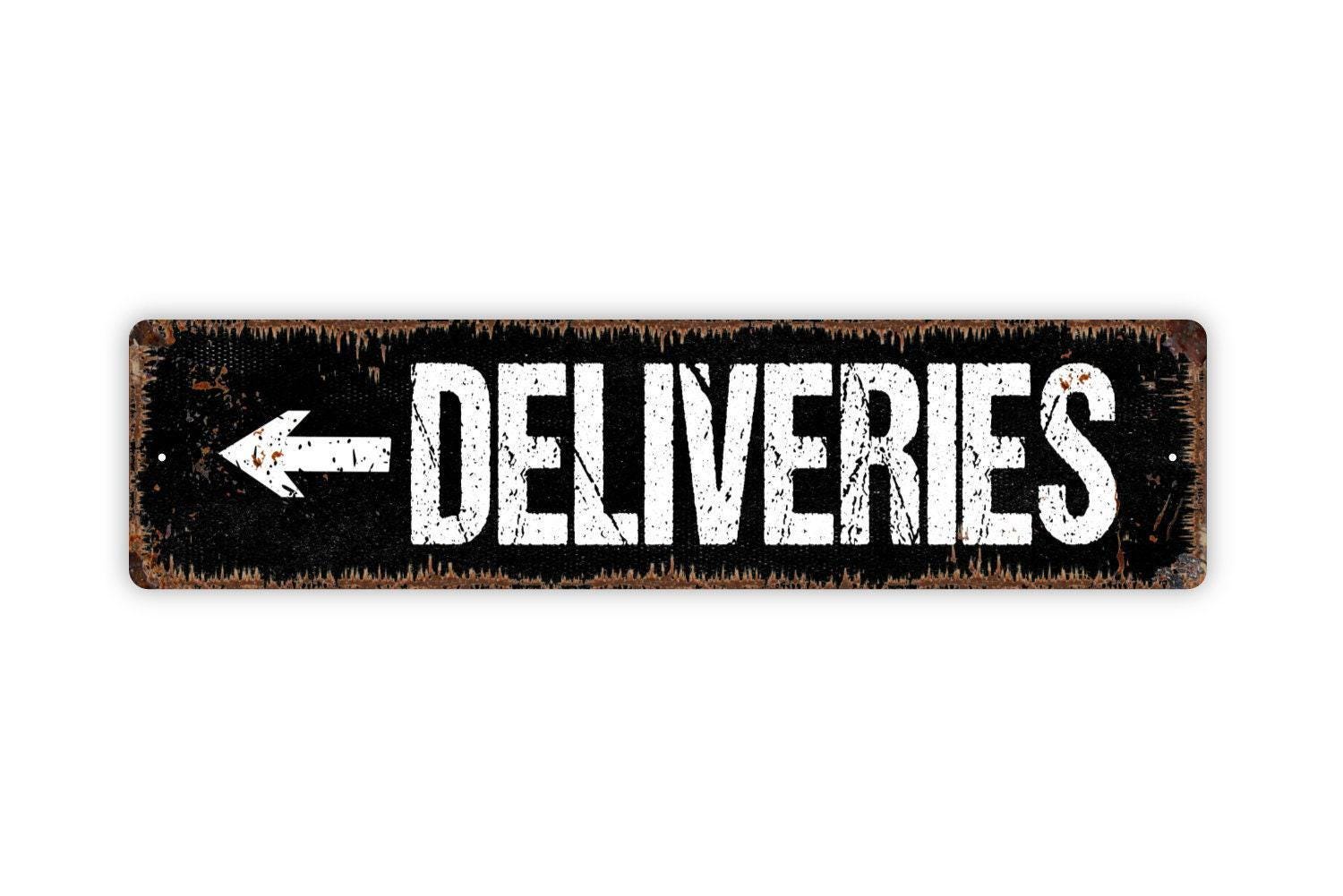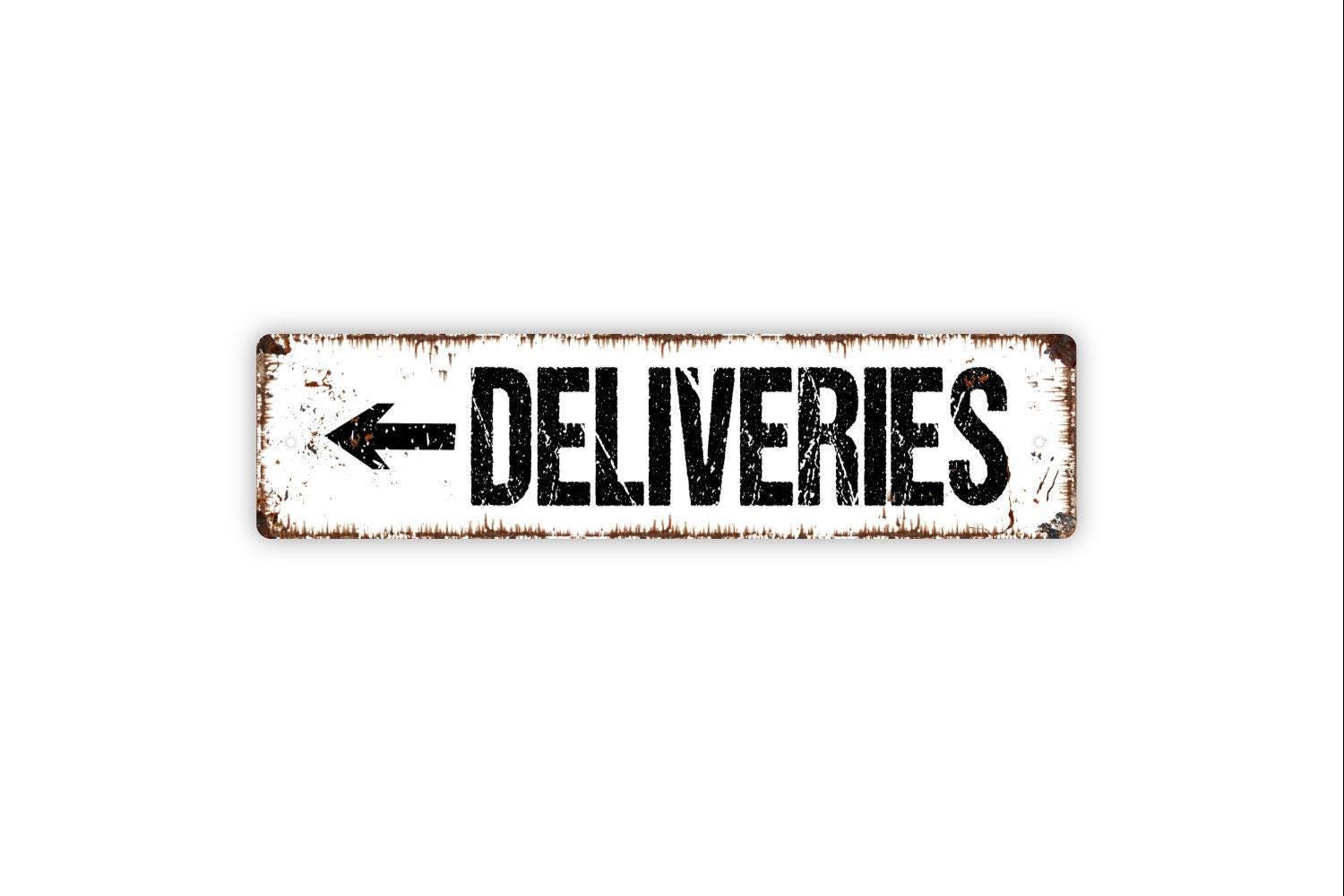 Deliveries Arrow Sign | Delivery Driver Metal Sign or Vinyl Sticker | Left or Right Arrow | Porch, Door, Business, or Property Decor