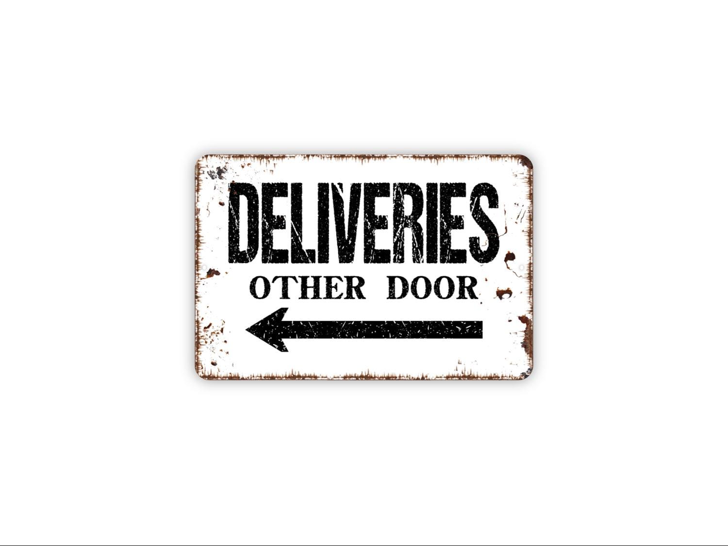 Deliveries Other Door With Arrow Sign | Delivery Driver Instruction Wall Décor | Business or Home Metal Sign or Vinyl Sticker Direction