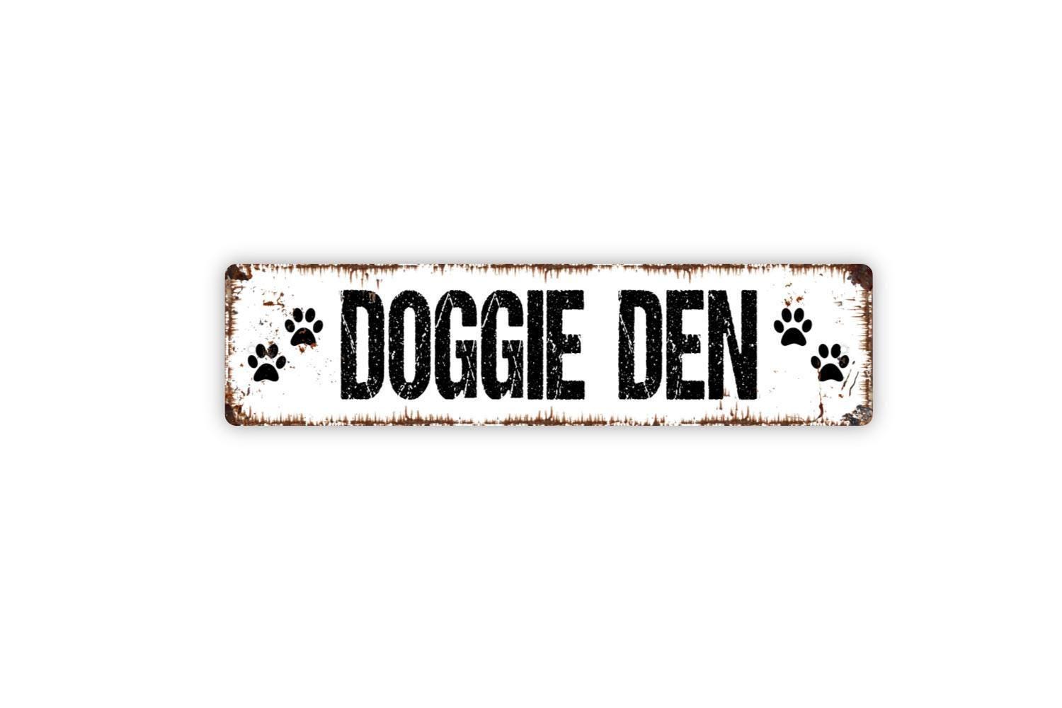 Doggie Den Sign - Dog Paw Print Crate House Vinyl Sticker Or Metal Street Sign or Door Name Plate Plaque Indoor or Outdoor Use