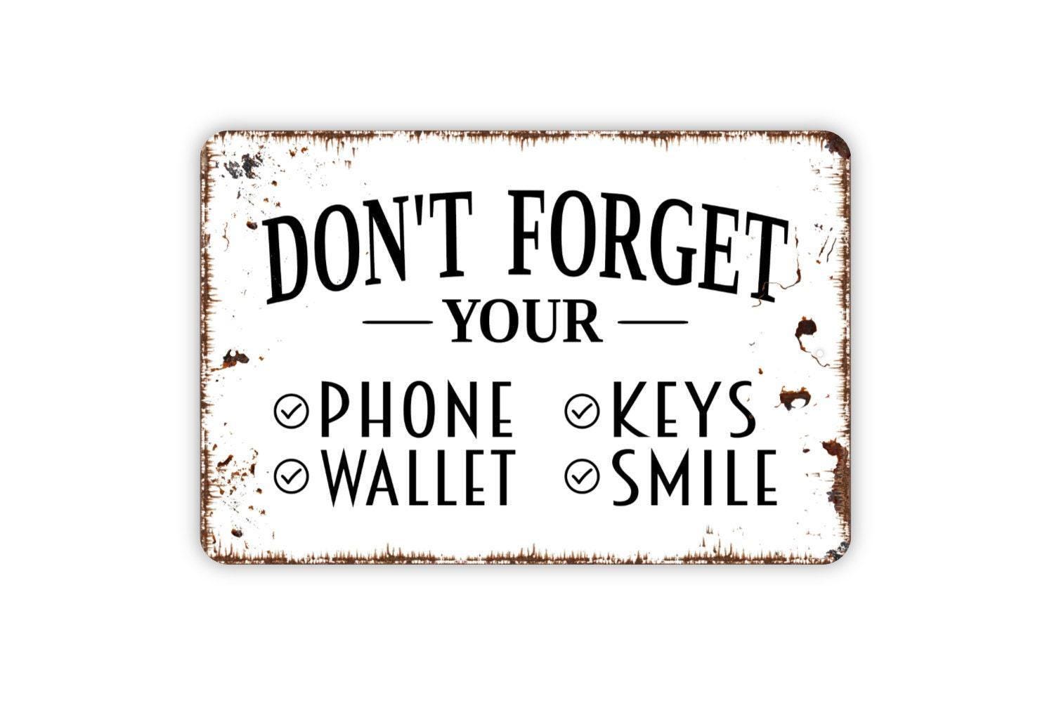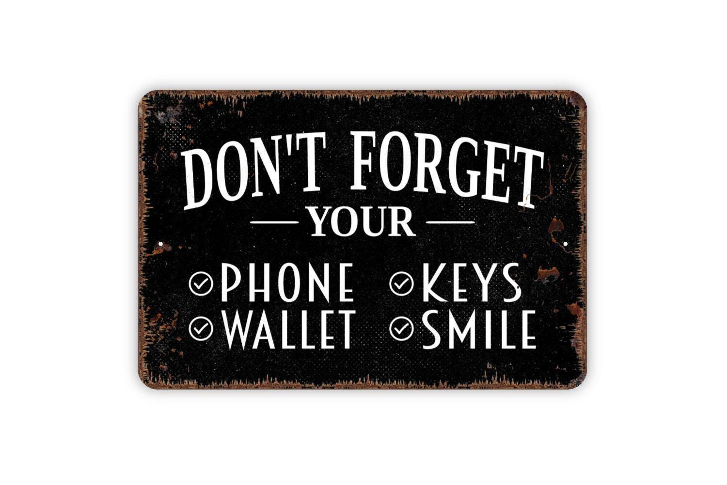 Don’t Forget Your Phone Wallet Keys Smile Sign | Funny Entryway Reminder | Metal Sign or Vinyl Sticker for Home Office Dorm