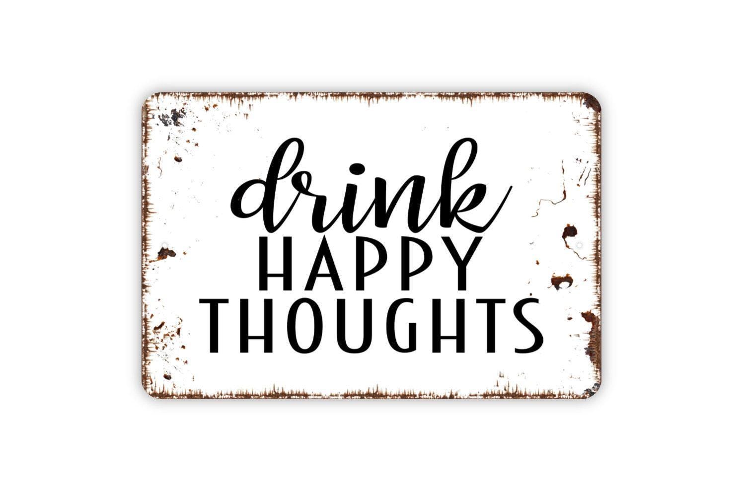 Drink Happy Thoughts Sign | Funny Bar Kitchen Wall Decor | Rustic Farmhouse Cocktail Wine Beer Humor Sign | Metal Sign or Vinyl Sticker