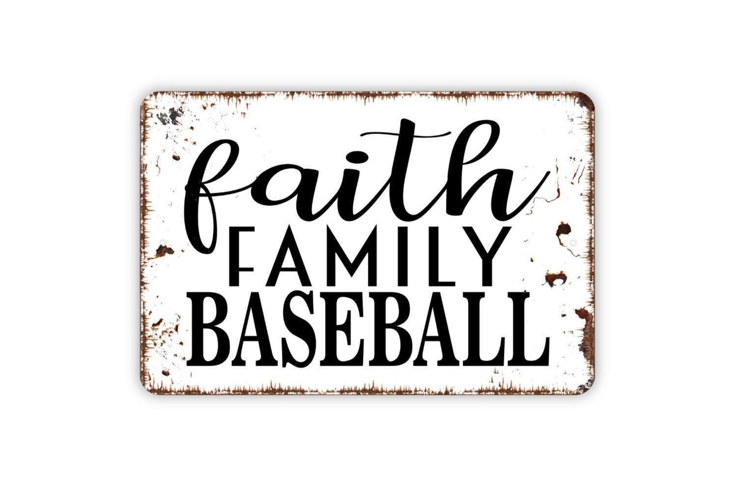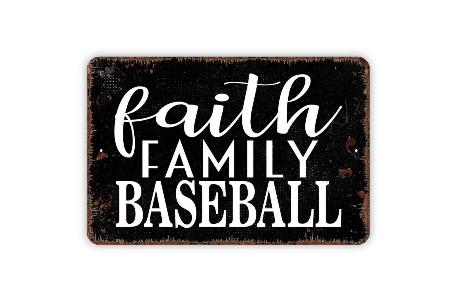 Faith Family Baseball Sign | Sports Metal Sign or Vinyl Sticker | Rustic Home, Team, Dugout, or Bedroom Wall Decor | Gift for Baseball Fans