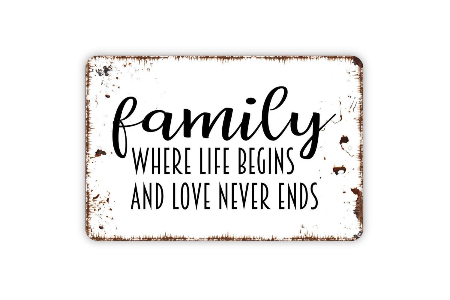 Family Where Life Begins And Love Never Ends Sign | Rustic Farmhouse Inspirational Wall Decor | Metal Sign or Vinyl Sticker for Home