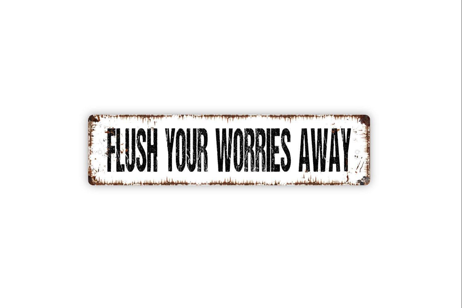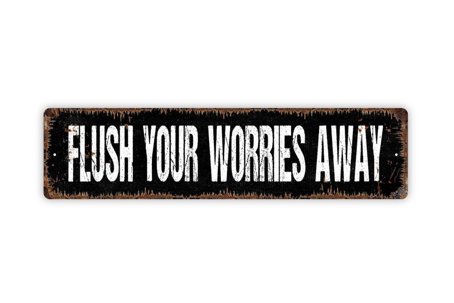 Flush Your Worries Away Sign Metal or Vinyl Sticker | Funny Bathroom Sign | Rustic Farmhouse Decor | Toilet Humor Sticker | Guest Bath Sign