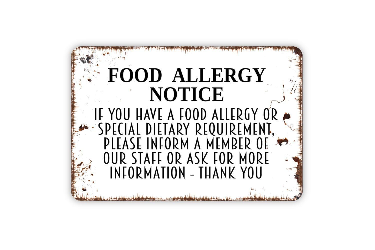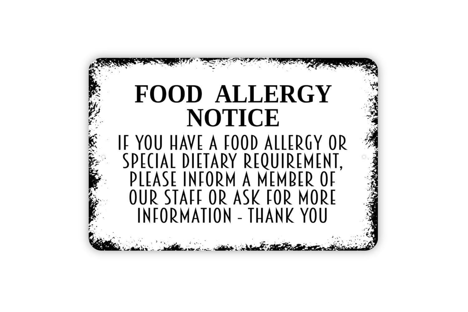 Food Allergy Notice Sign| Restaurant Cafe Kitchen Allergy Alert | Metal Sign or Vinyl Sticker for Food Safety and Compliance