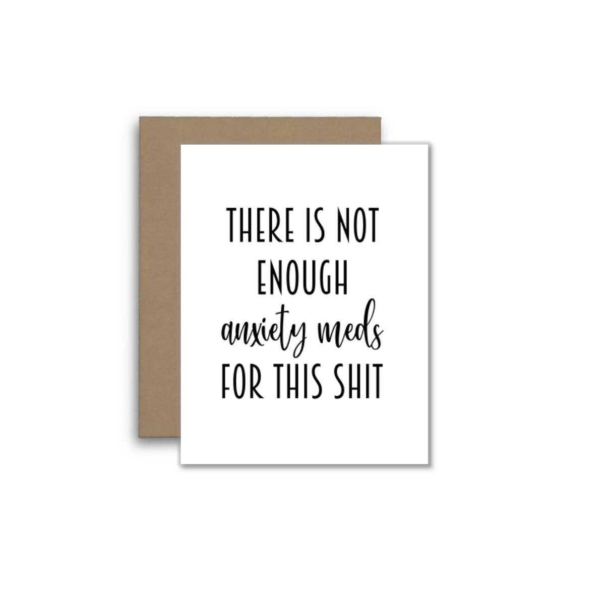 There is not enough anxiety meds for this shit. This hilariously relatable greeting card is perfect for friends, coworkers, or family members who are navigating life’s chaos with a little humor (and maybe a prescription).