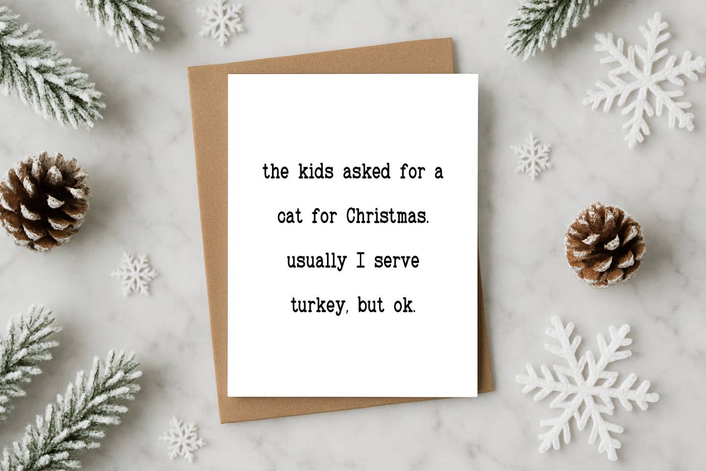 The kids asked for a cat for Christmas. I usually serve a turkey, but okay. This cheeky holiday card is perfect for friends and family who appreciate a little twisted humor with their festive cheer.