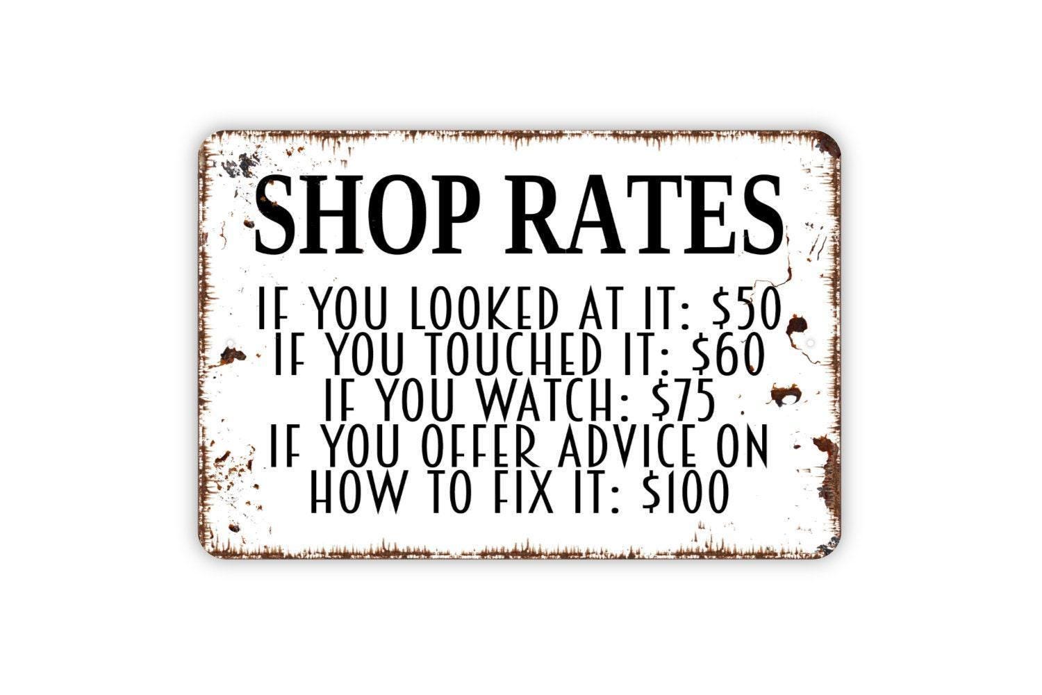 Funny Shop Rates Sign Metal or Vinyl Sticker | Mechanic Garage Sign | Rustic Workshop Decor | Auto Repair Wall Art | Man Cave Gift Sticker