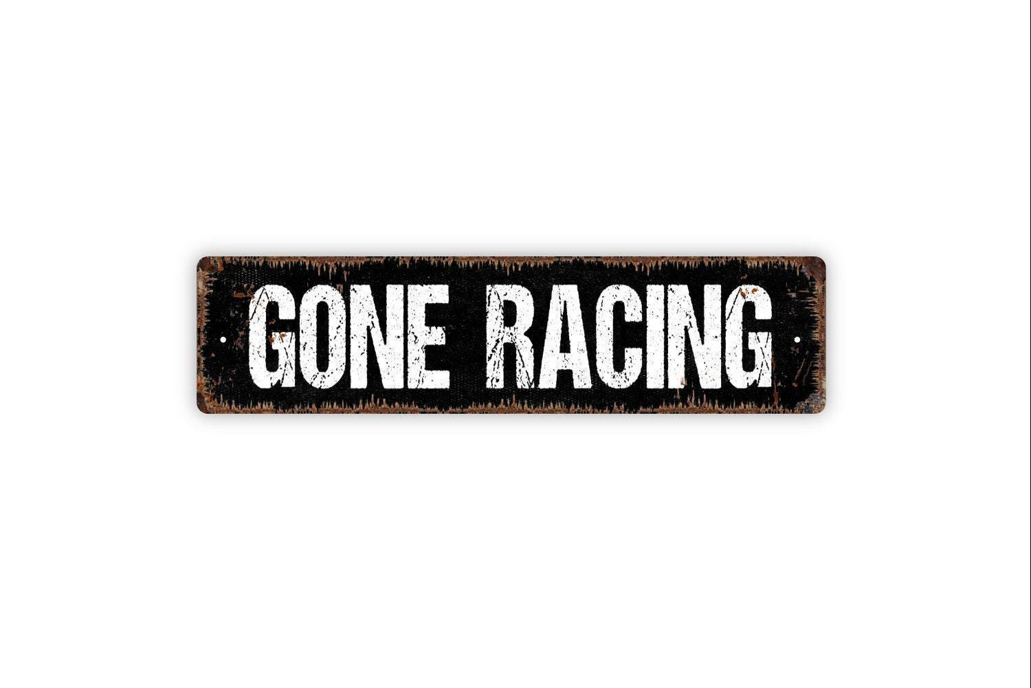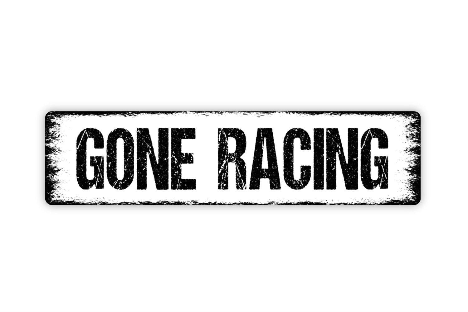 Gone Racing Sign - Vinyl Sticker Or Custom Metal Street Sign or Door Name Plate Plaque