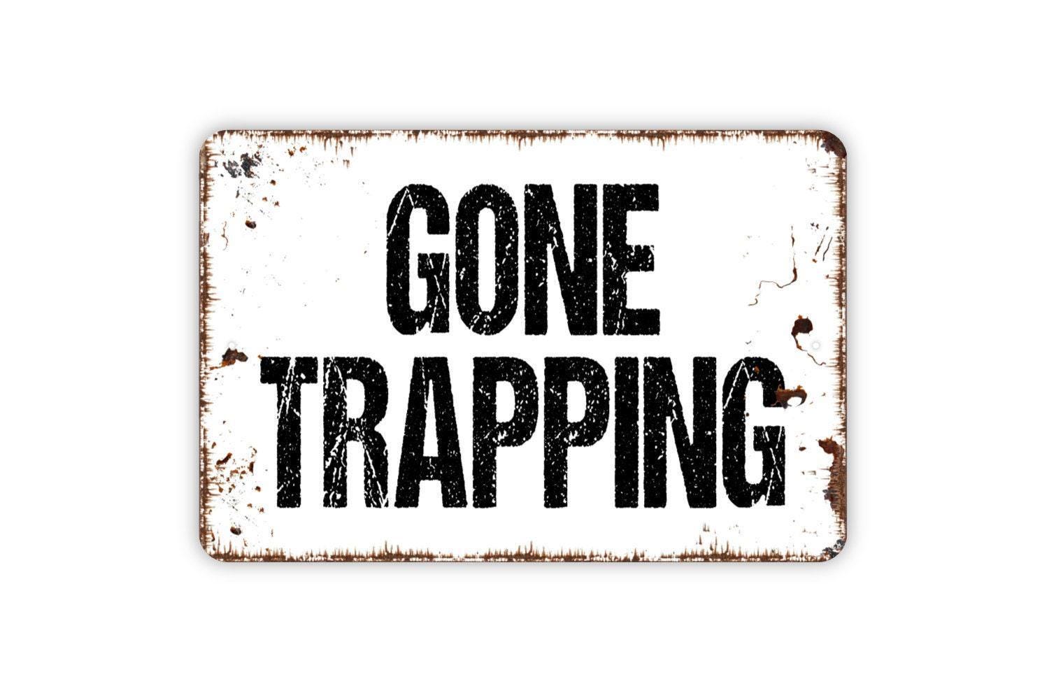 Gone Trapping Sign | Rustic Hunting Cabin Outdoor Decor | Metal Sign or Vinyl Sticker for Lodge Barn Shed Camp