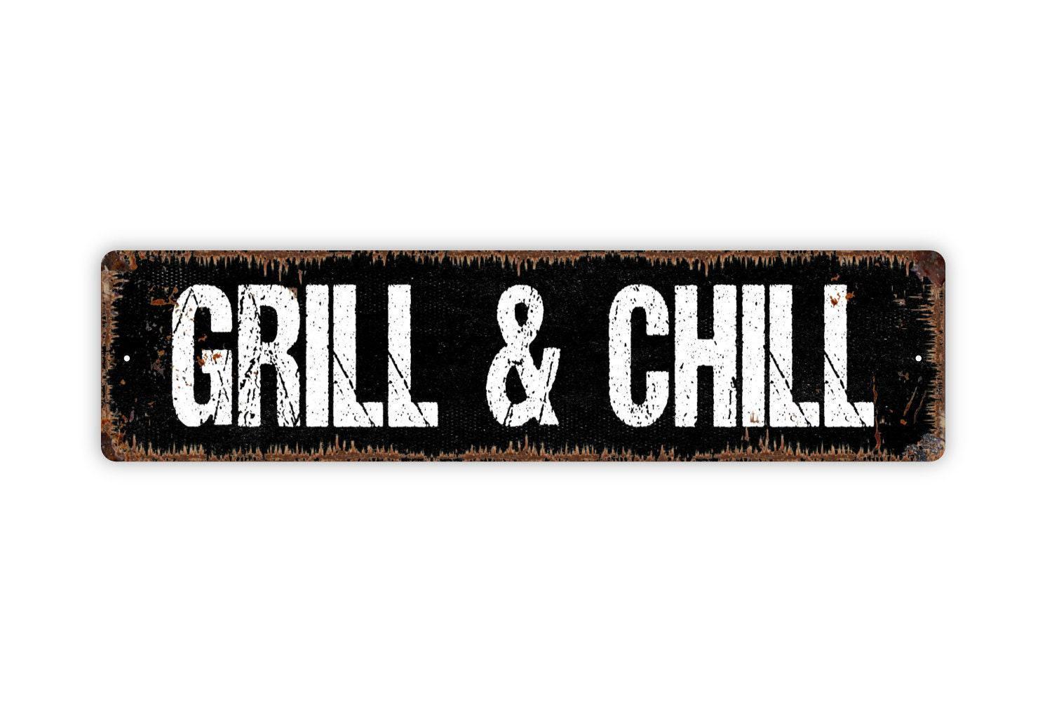 Grill And Chill Sign - Grill Station Backyard Paradise BBQ Patio Deck Vinyl Sticker Or Street Metal Sign or Door Name Plate Plaque