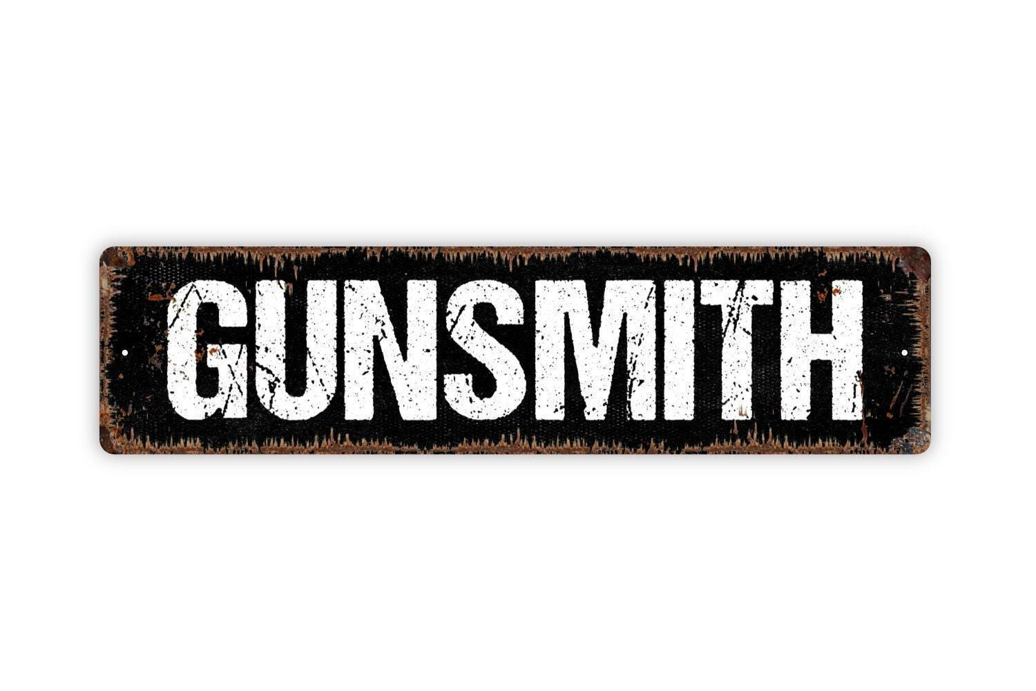 Gunsmith Sign - Buy Sell Trade Firearms Rifle Hunting Store Vinyl Sticker Or Street Metal Sign or Door Name Plate Plaque
