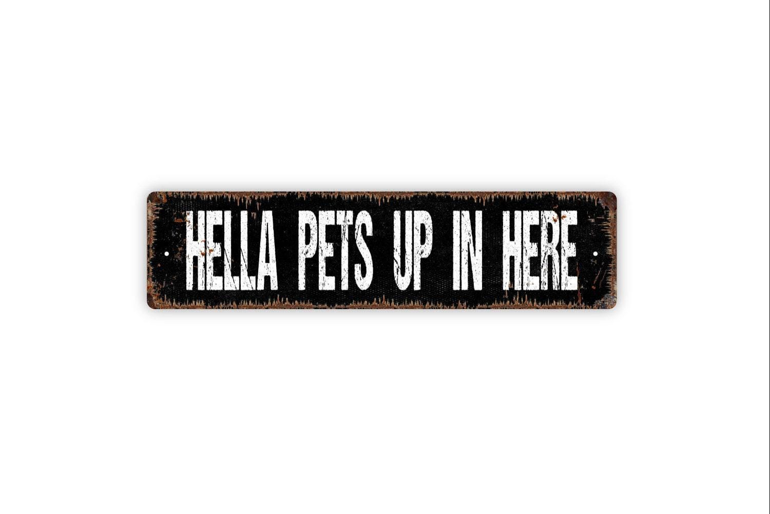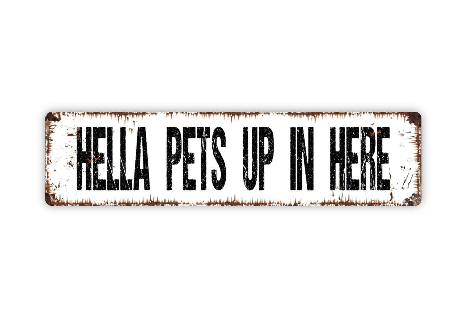 Hella Pets Up in Here Sign - Funny Dog And Cat Pet Owner Vinyl Sticker Or Street Metal Sign or Door Name Plate Plaque