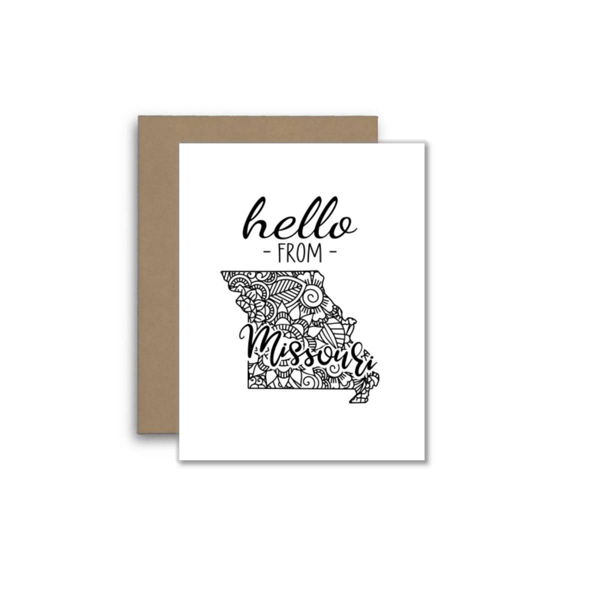 Send heartfelt greetings with this Hello from Missouri design featuring a detailed boho mandala within the state outline. A perfect balance of modern bohemian artistry and Missouri state pride.