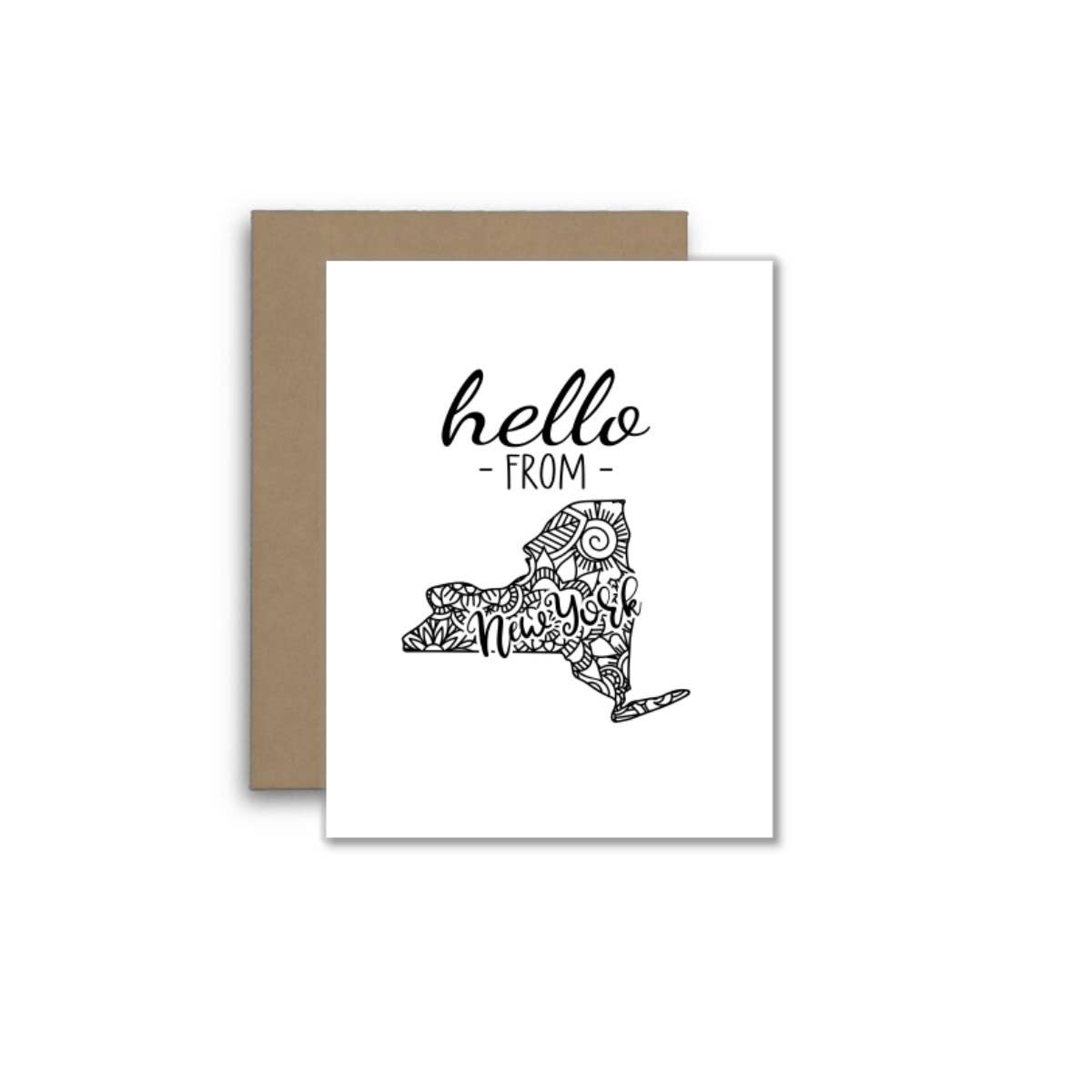 Celebrate the Empire State with this Hello from New York card, featuring a beautifully intricate boho mandala design within the New York state outline. A perfect mix of urban charm and artistic flair, this card makes a stylish way to share greetings or show off New York pride.