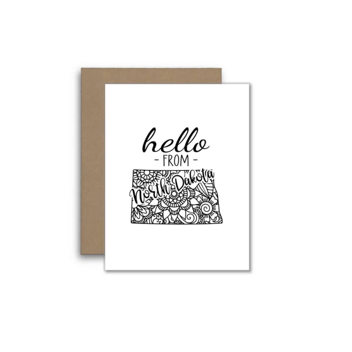 Share a thoughtful Hello from North Dakota with this unique card featuring a boho mandala design set inside the state’s outline. A perfect balance of artistic flair and state pride, this card celebrates the beauty of North Dakota in a modern, free-spirited way.
