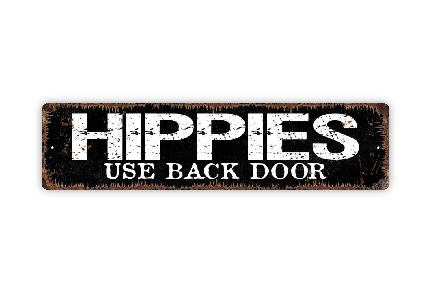 Hippies Use Back Door Sign | Funny Retro Wall Decor | Metal Sign or Vinyl Sticker for Home, Porch, Bar, or Hippie Lovers