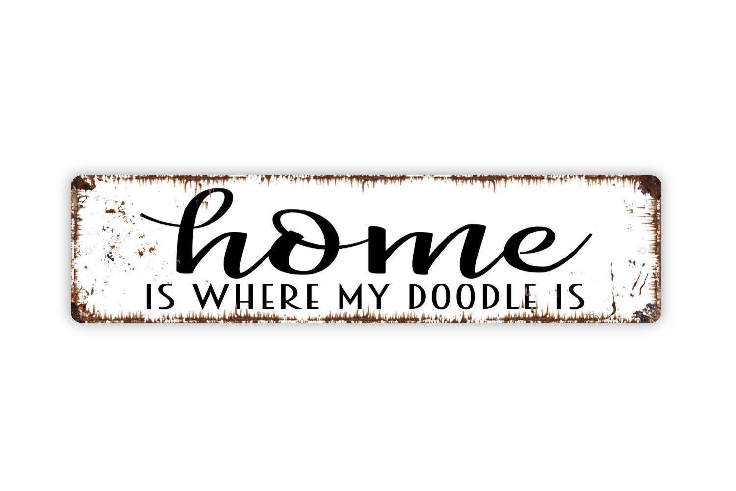 Celebrate your love for your doodle with this Home Is Where My Doodle Is Sign. Perfect for Labradoodle, Goldendoodle, or any doodle-loving home, it adds a sweet and playful touch to your wall decor. Available in multiple sizes as a metal sign or vinyl sticker for any space.