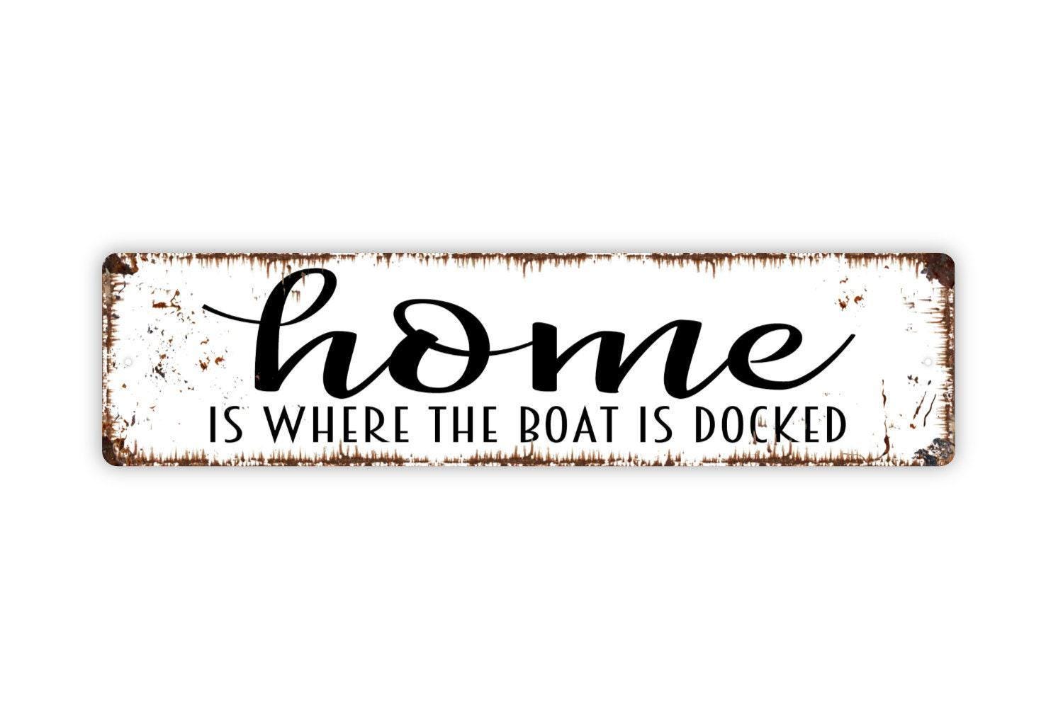 Home Is Where The Boat Is Docked Sign - Lake House Beach River Boat Dock Vinyl Sticker Or Street Metal Sign or Door Name Plate Plaque