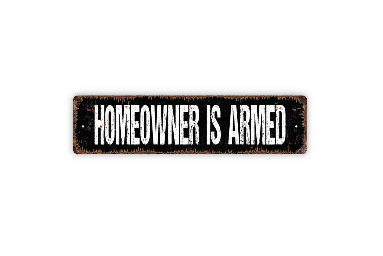 Homeowner Is Armed Sign - Warning Caution Protected Private Property Vinyl Sticker Or Metal Street Sign or Door Name Plate Plaque