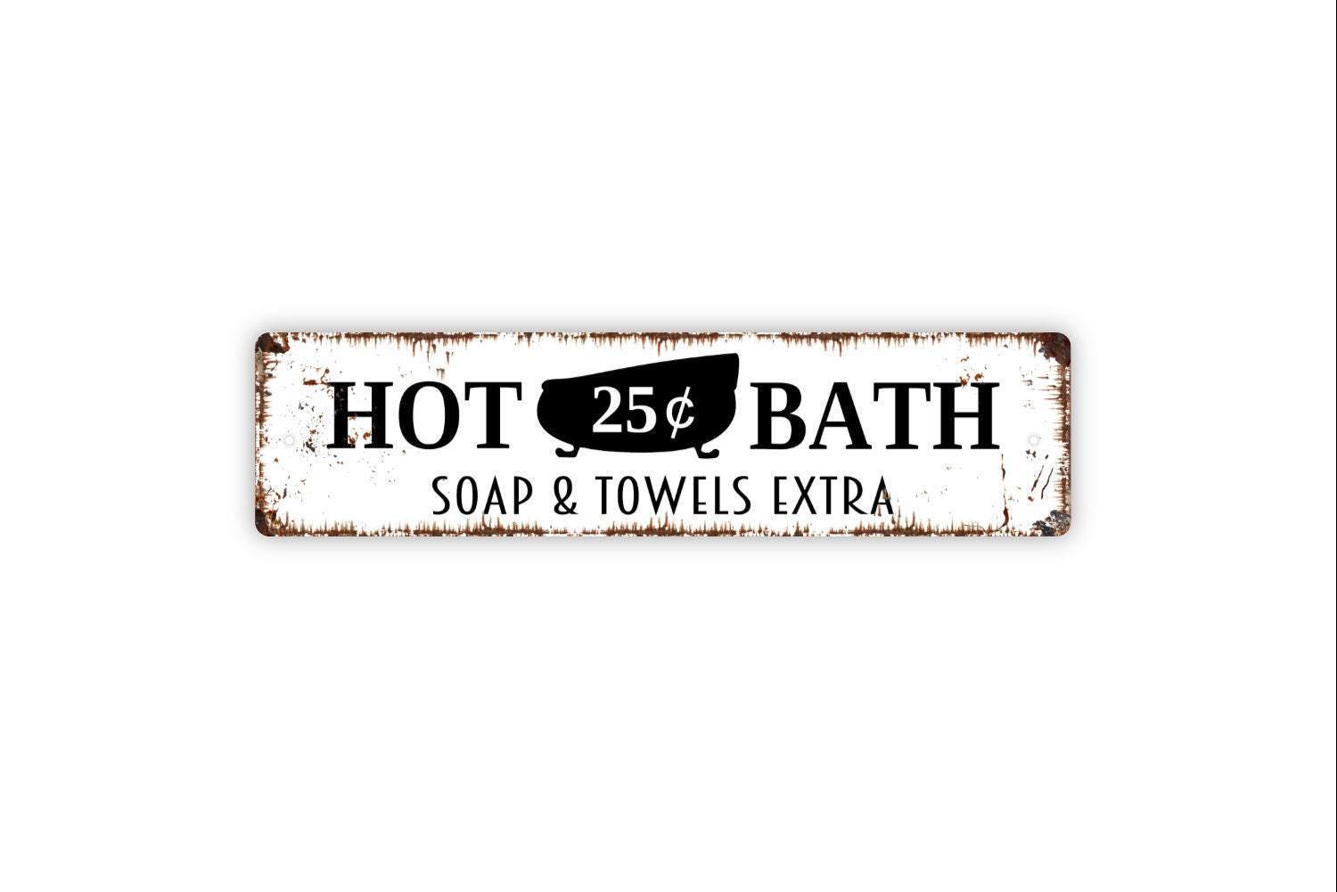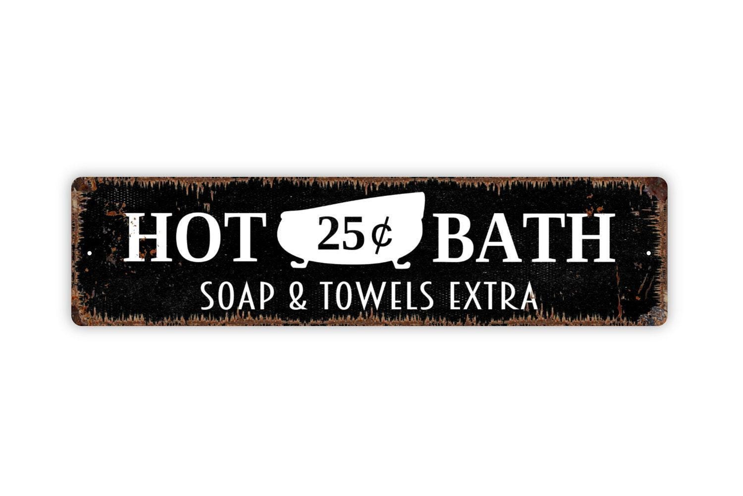 Hot Bath Soap And Towels Extra Sign | Rustic Bathroom Wall Decor | Farmhouse Washroom Sign | Custom Metal Sign or Vinyl Sticker