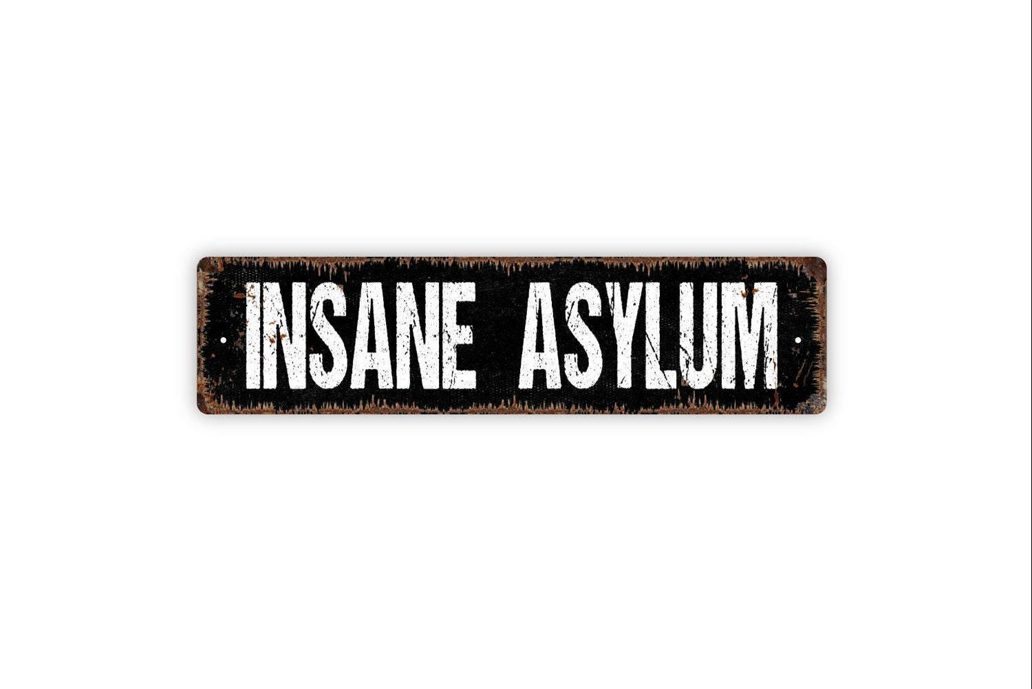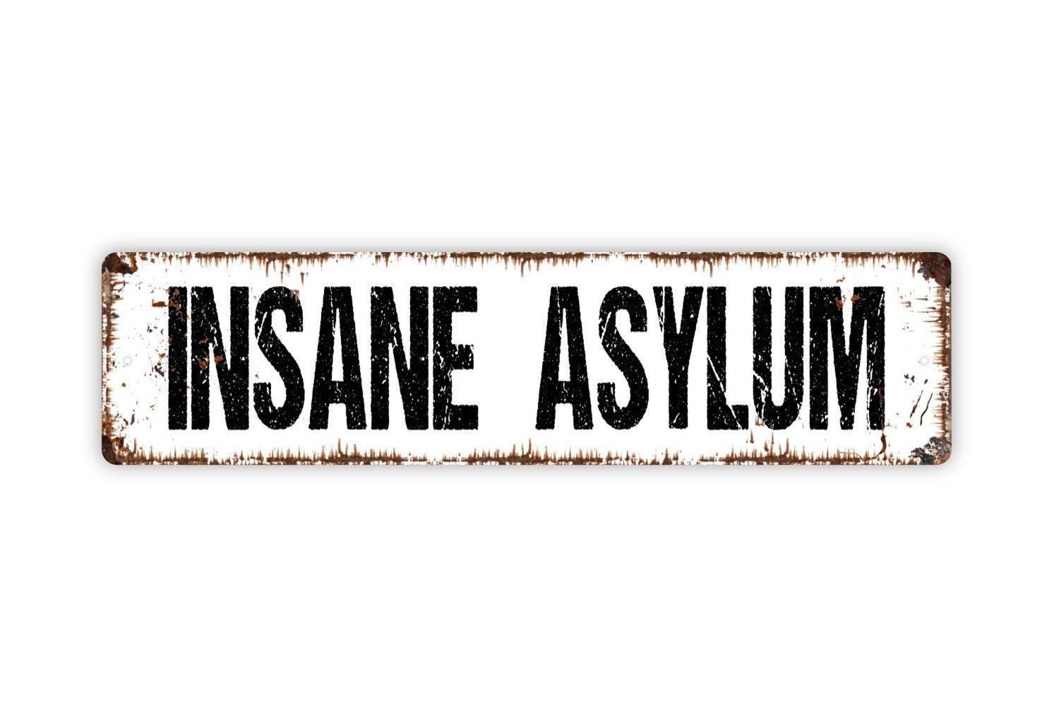 Insane Asylum Sign – Creepy Halloween Haunted House Wall Decor – Spooky Horror Scary Party Prop Sign – Metal Sign or Sticker