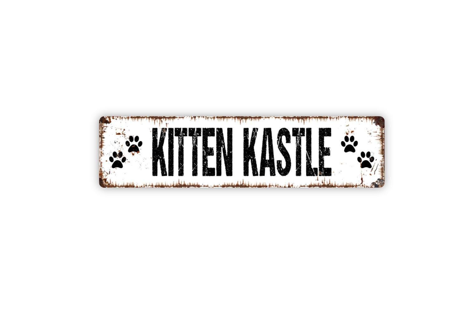 Kitten Kastle Sign - With Paw Prints Cat Catio Feline Castle Den Metal Street Sign or Door Name Plate Indoor or Outdoor Use