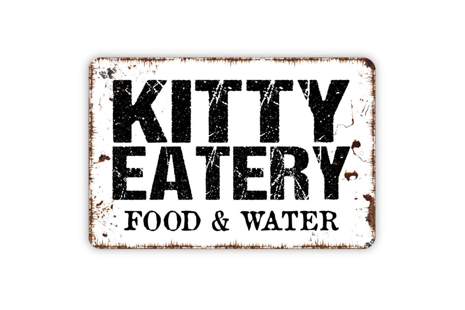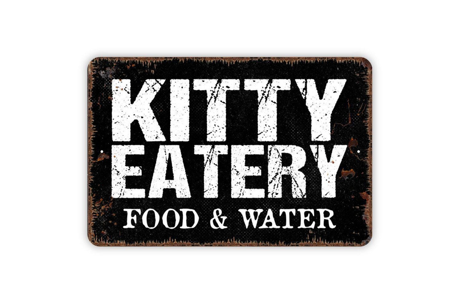 Kitty Eatery Food and Water Sign | Cute Cat Feeding Station Kitchen Décor | Pet Lover Gift Metal Cat Sign or Vinyl Sticker for Cat Owners
