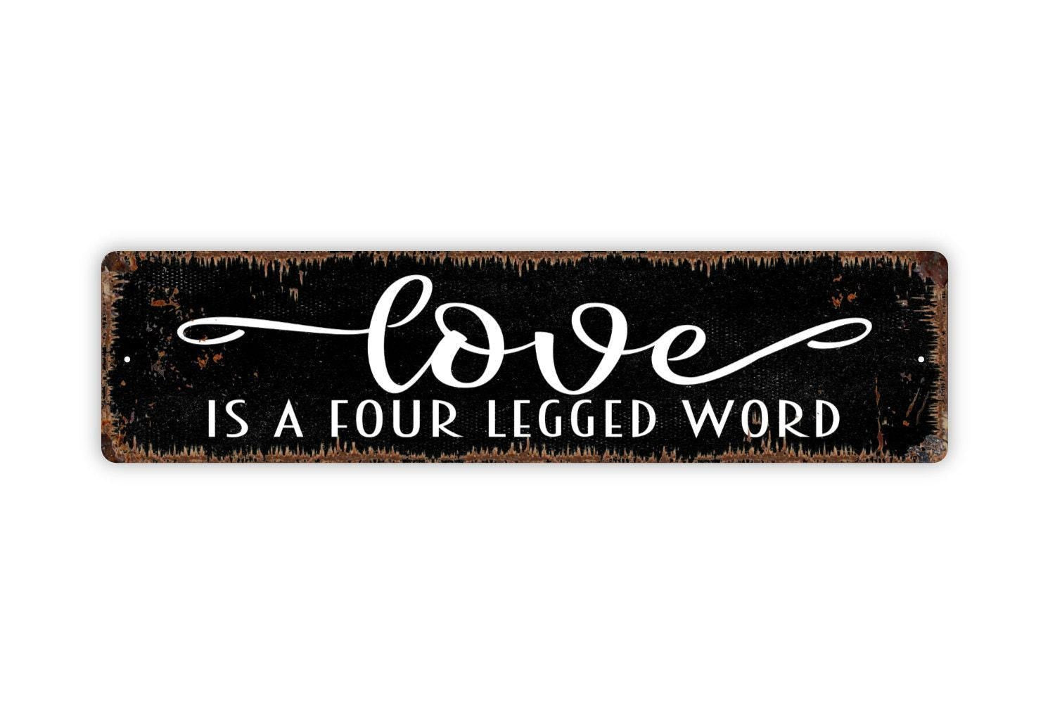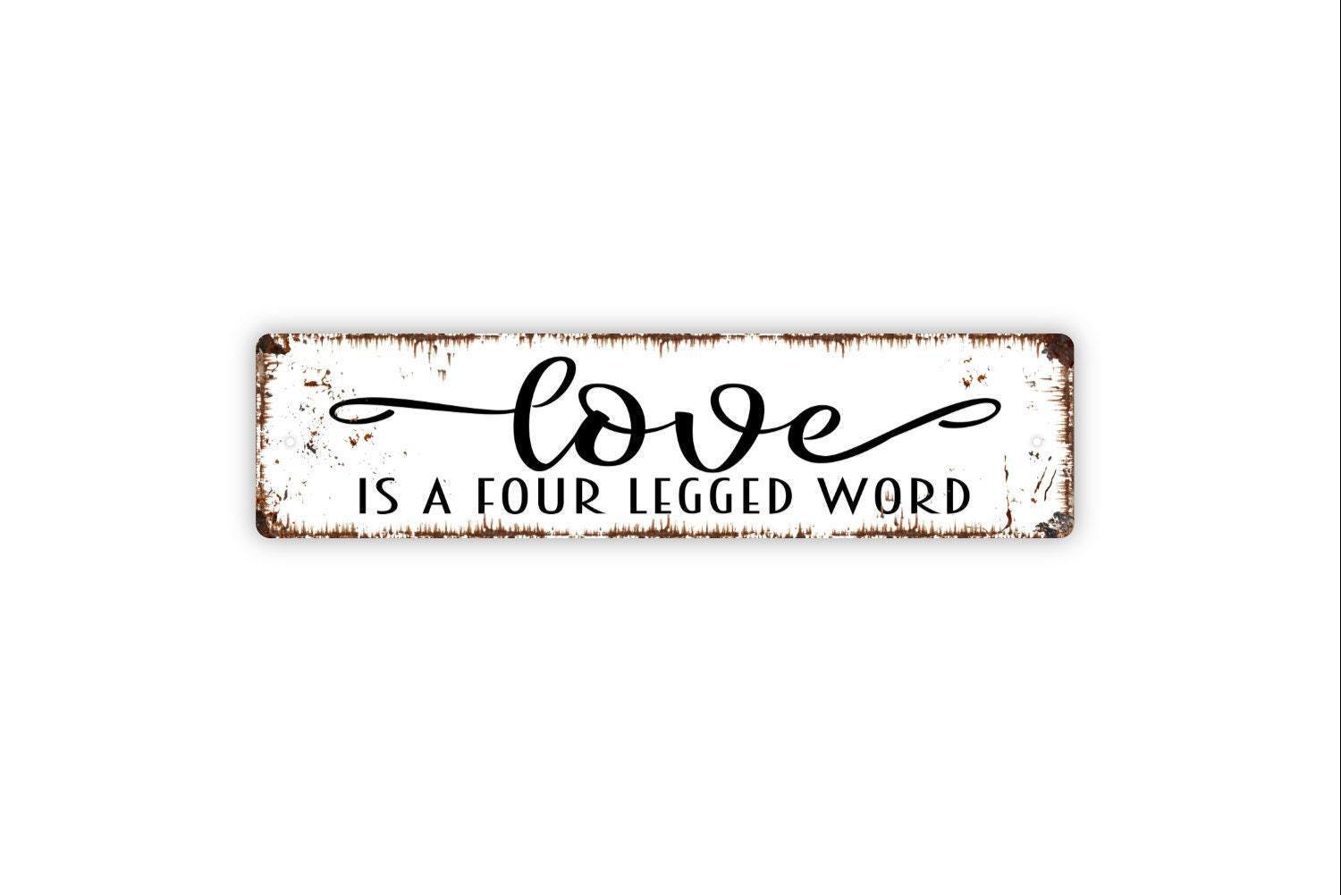 Love Is A Four Legged Word Sign | Pet Lover Wall Decor | Rustic Farmhouse Dog Cat Sign | Metal Sign or Vinyl Sticker | Animal Lover Gift
