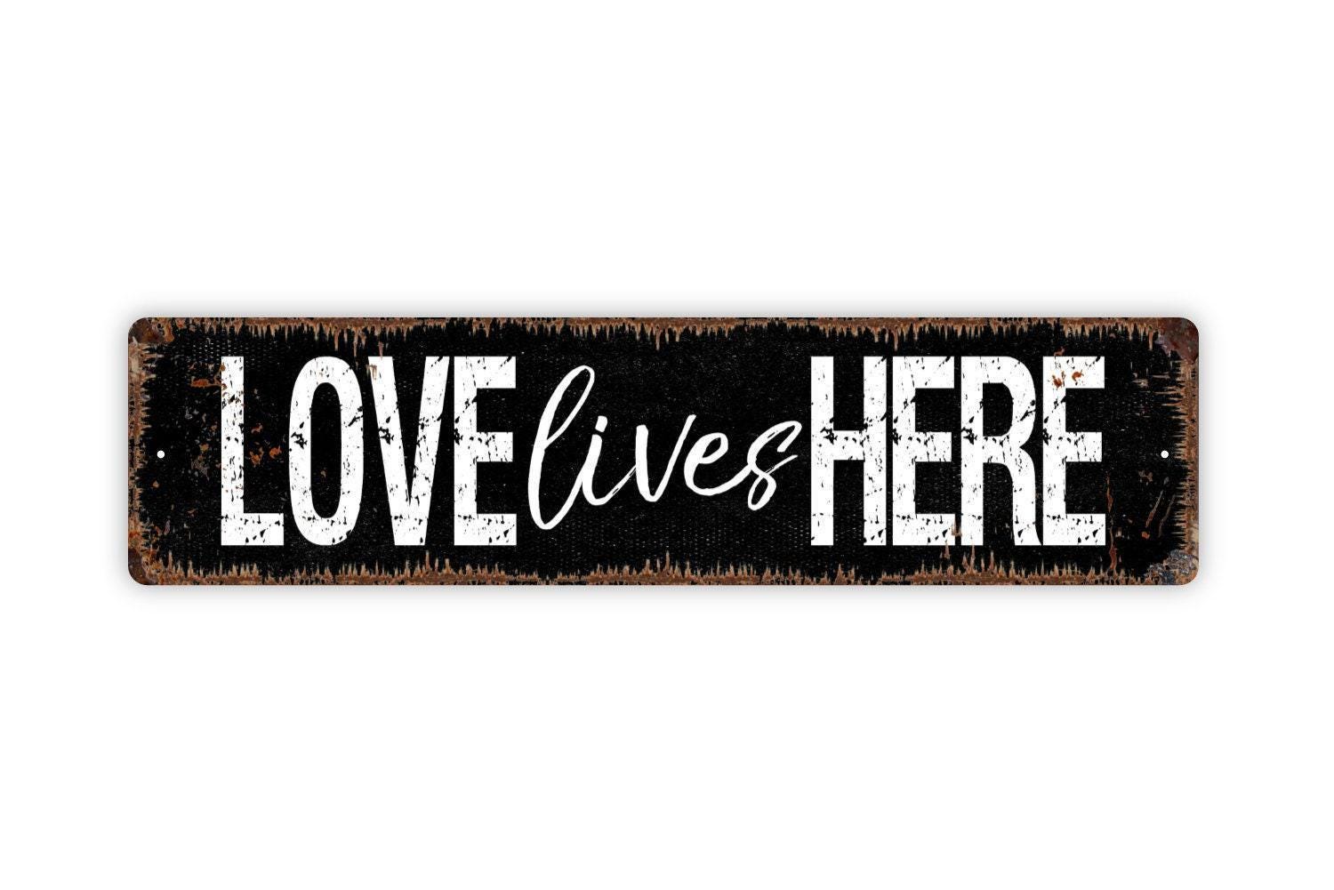 Love Lives Here Sign Metal or Vinyl Sticker | Rustic Farmhouse Home Decor | Family Quote Sign | Romantic Gift | Country House Decoration
