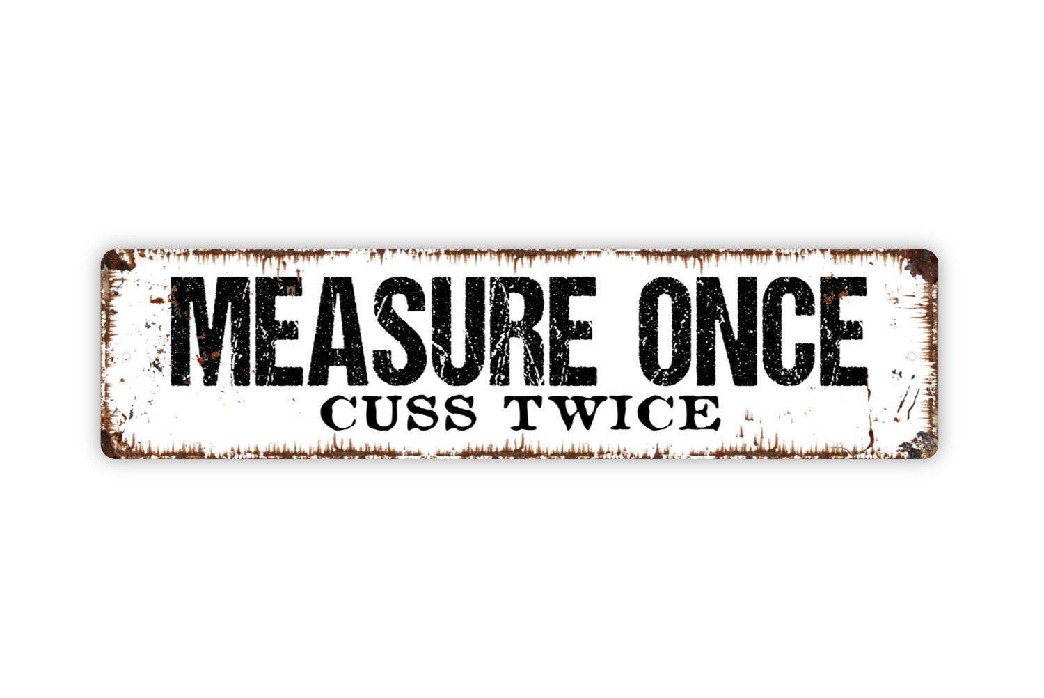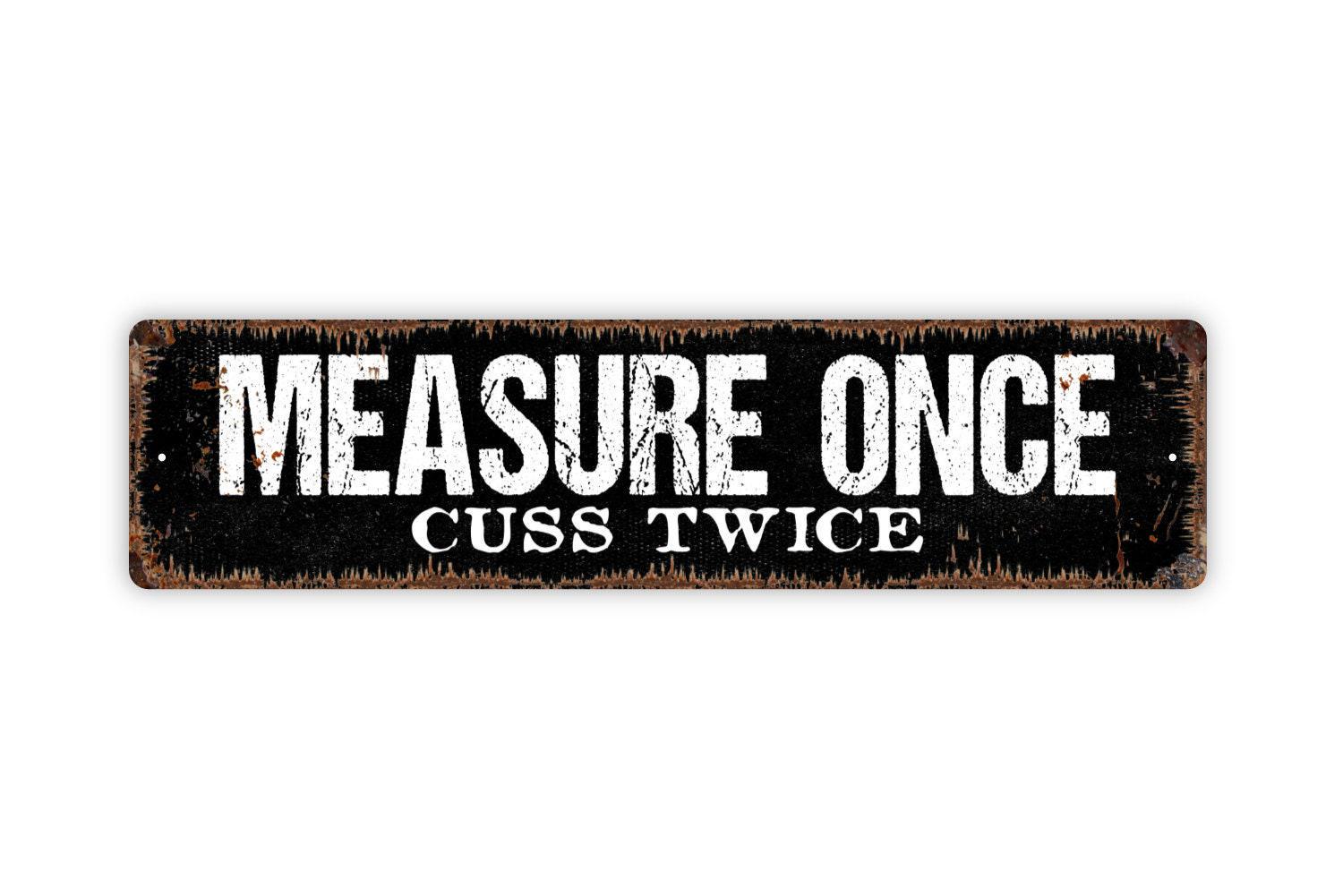 Measure Once Cuss Twice Sign - Funny Kitchen Tool Shed Workshop Vinyl Sticker Or Metal Street Sign or Door Name Plate Plaque