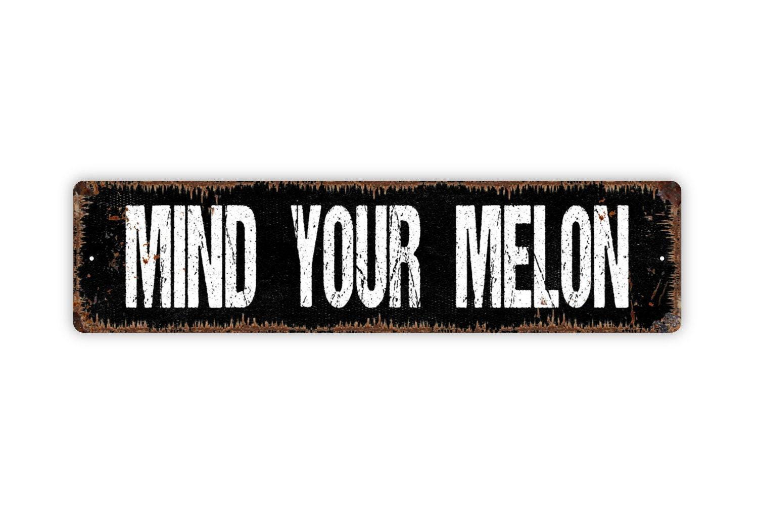 Mind Your Melon Sign - Warning Vinyl Sticker Or Custom Metal Street Sign or Door Name Plate Plaque