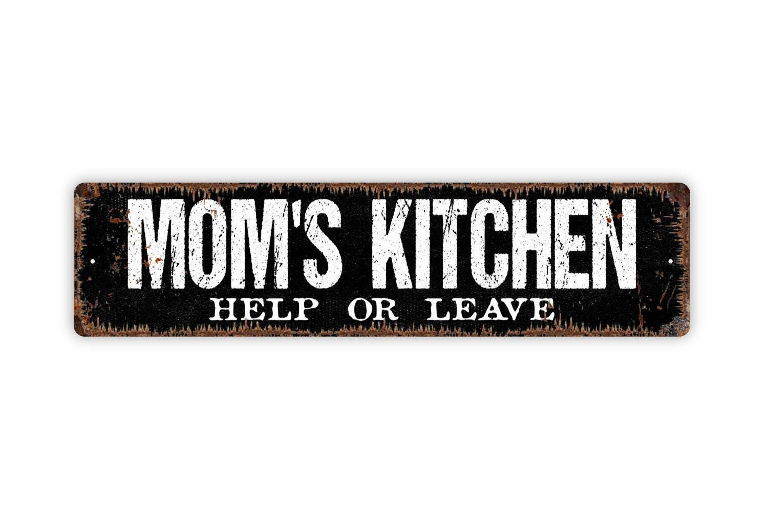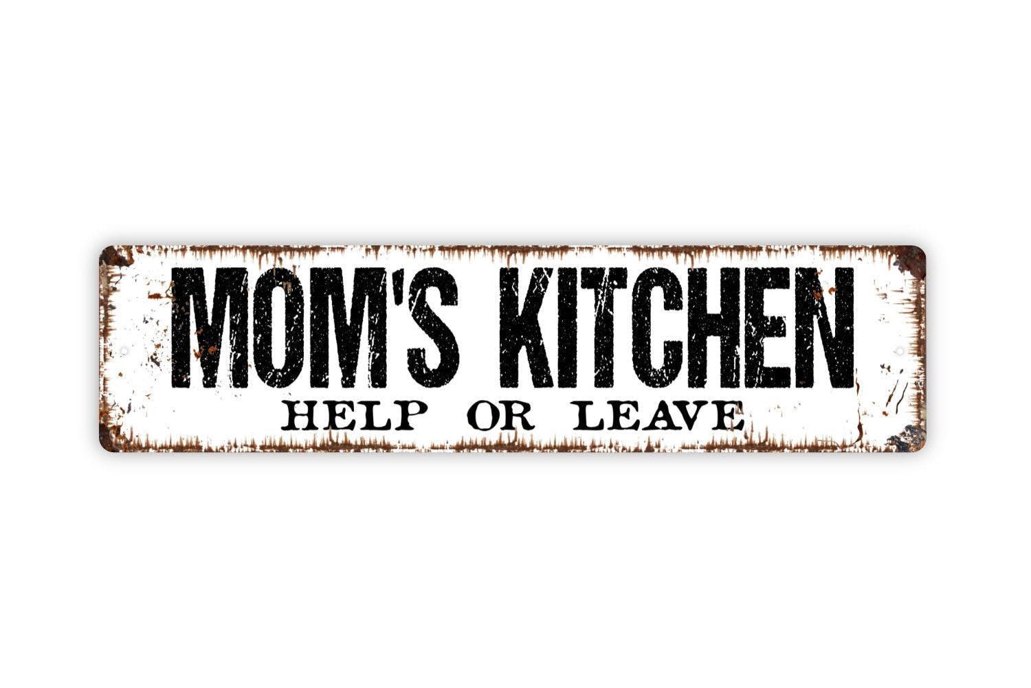 Mom's Kitchen Help Or Leave Sign - Funny Kitchen Pantry Mom Mother Grandma Vinyl Sticker Or Street Metal Sign or Door Name Plate Plaque