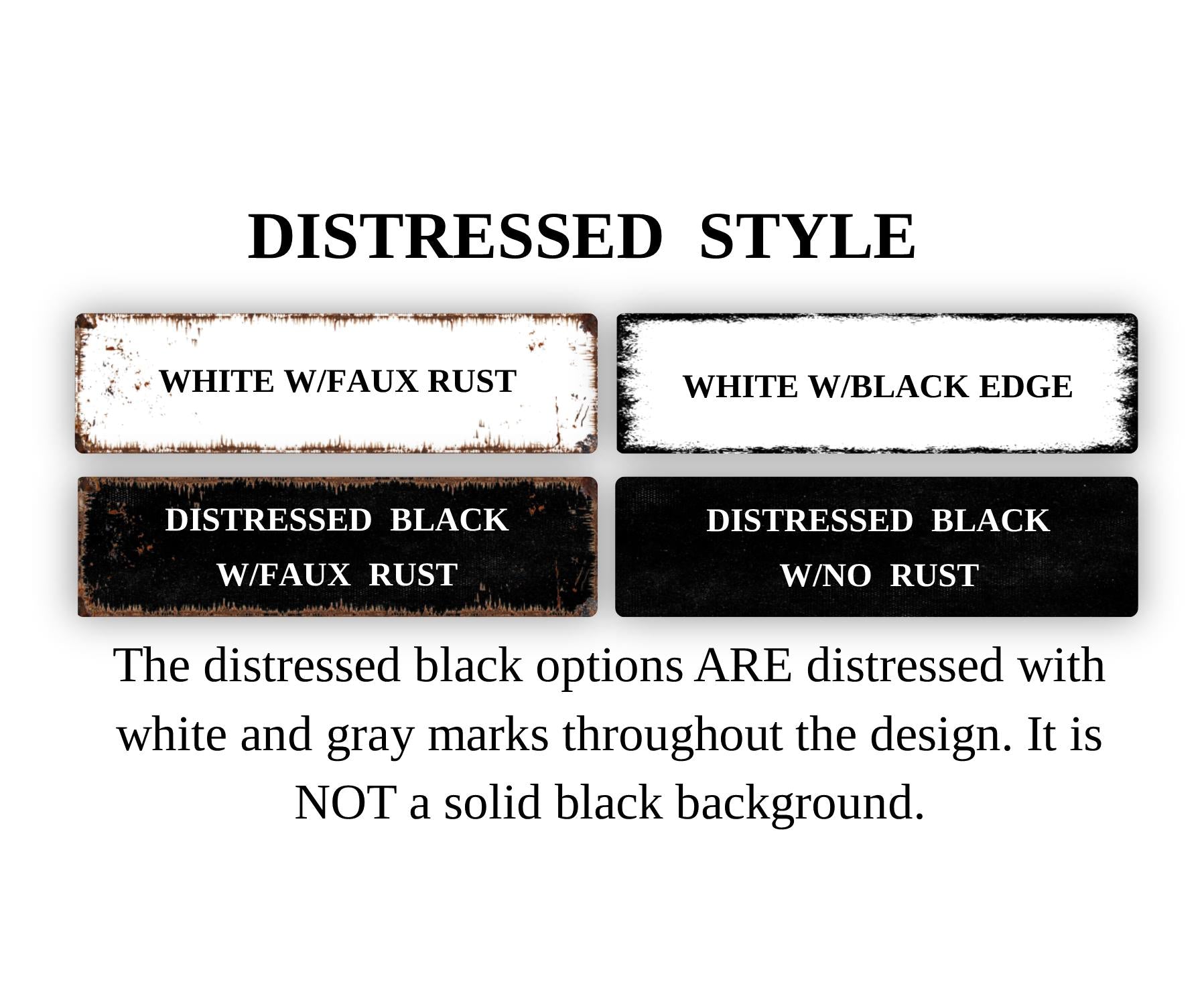 NOTE: The Metal Signs Are NOT Stickers. The Design Is Printed Directly On The Metal. Also, Aluminum Metal Is NOT Magnetic. The distressed black options ARE distressed with white and gray marks throughout the design. It is NOT a solid black background.