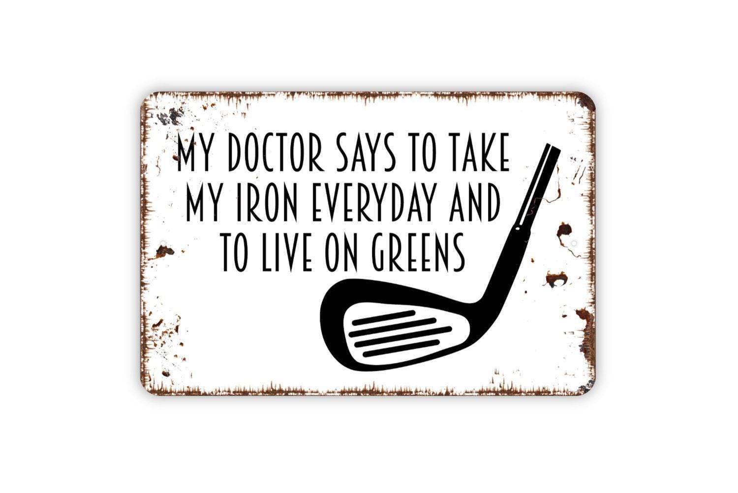 My Doctor Says To Take My Iron Everyday And To Live On Greens Sign Metal or Vinyl Sticker | Funny Golf Sign | Golfer Gift | Rustic Man Cave