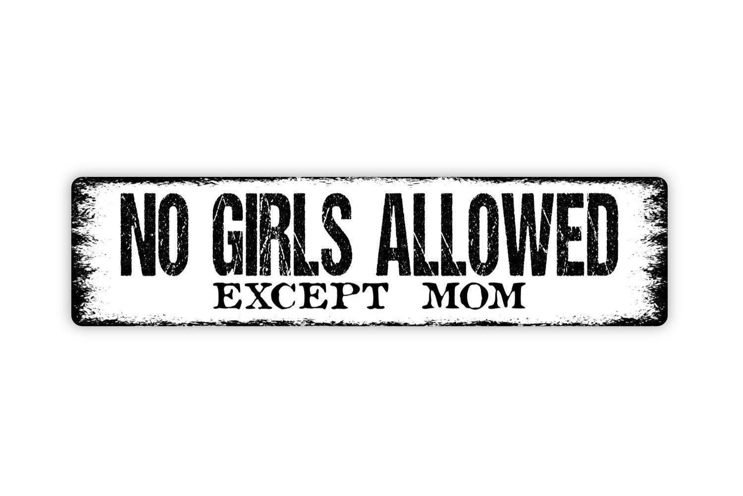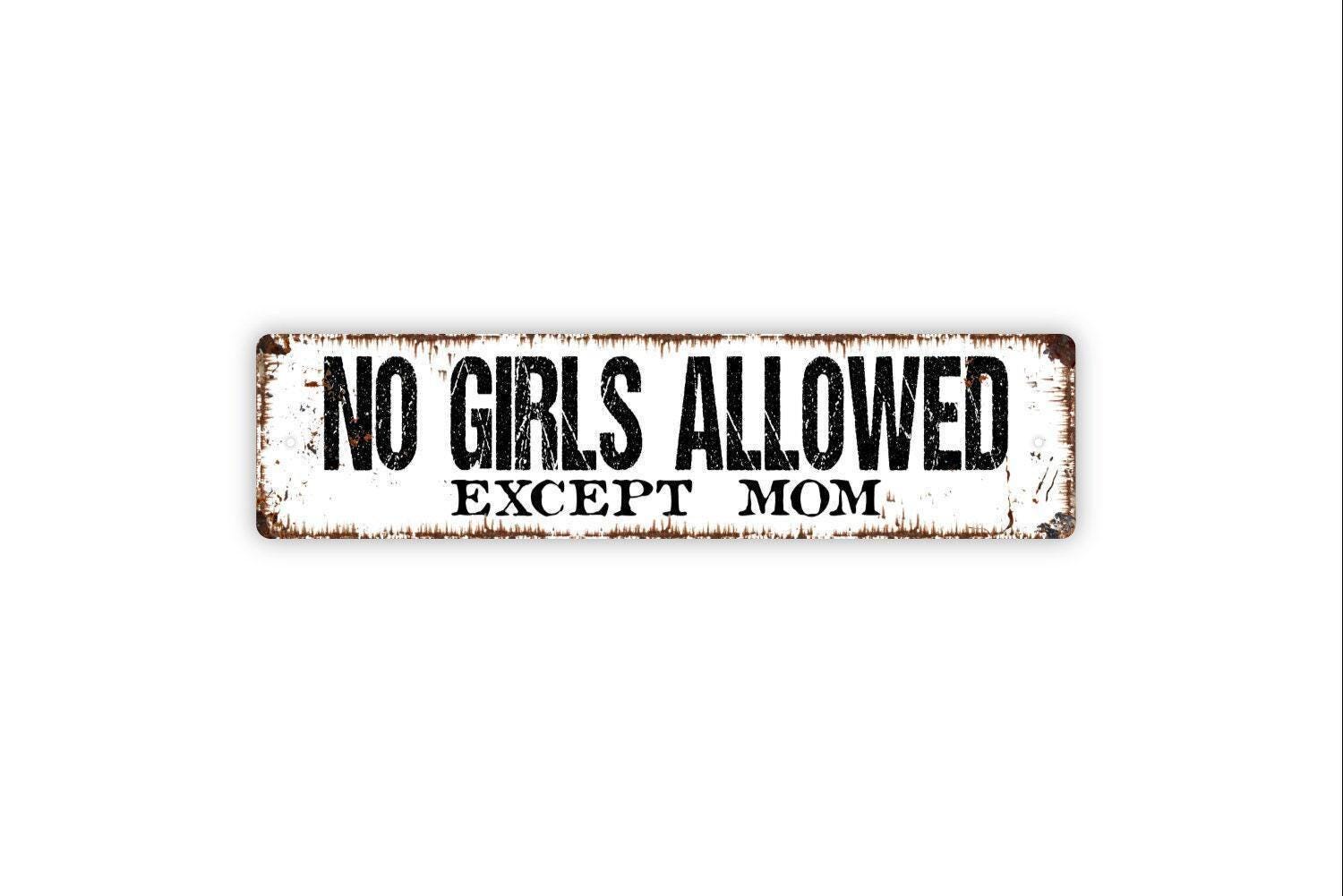 No Girls Allowed Except Mom Sign - Vinyl Sticker Or Metal Street Sign or Door Name Plate Plaque