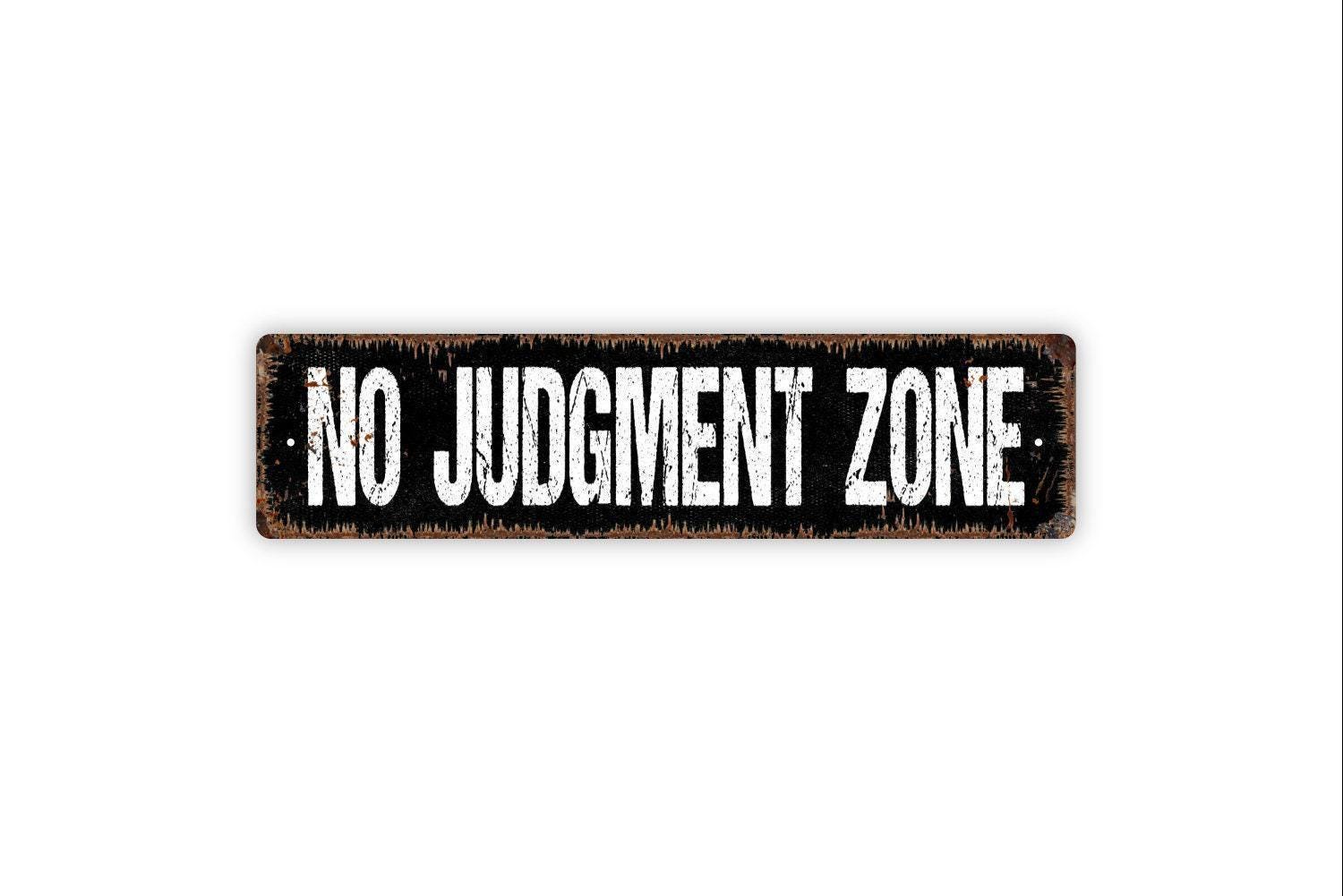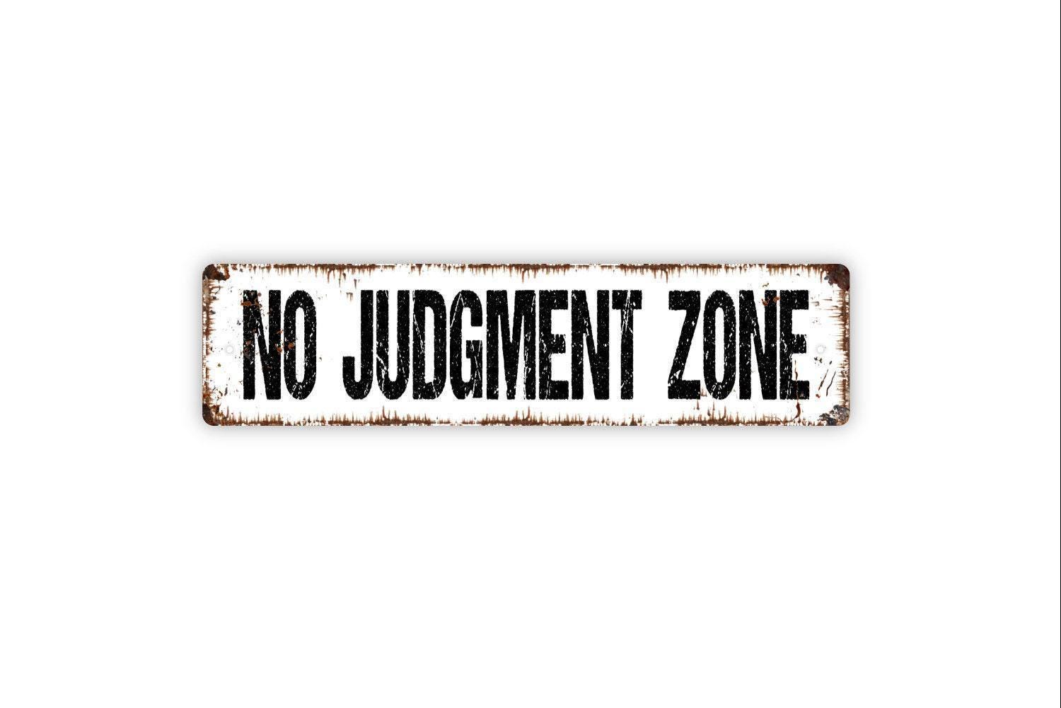 No Judgment Zone Sign | Funny Motivational Wall Decor | Rustic Home Office Gym Therapy Room Positive Quote Metal Sign or Vinyl Sticker