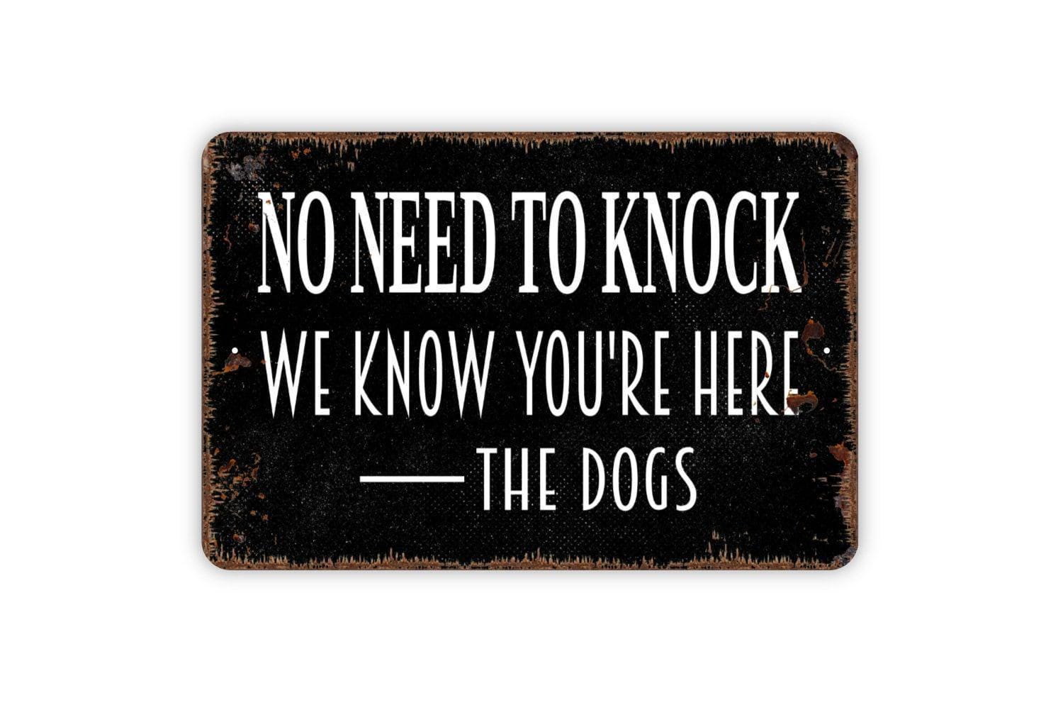 No Need To Knock We Know You’re Here The Dogs Sign | Funny Dog Lover Front Door or Porch Wall Sign | Pet Owner Metal Sign or Vinyl Sticker